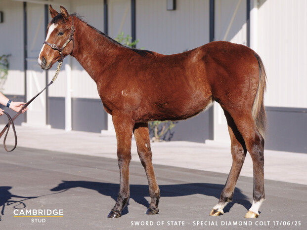 SWORD OF STATE (AUS) (Bay or Brown 2018-Stud 2022). Champion 2YO in NZ in 2020-21. 6 wins-4 at 2-at 1100m, 1200m, NZ$295,150, A$37,850, ARC Diamond S., Gr.1, Auckland TR Almanzor Trophy, Gr.3, King's P., Gr.3, Matamata RC Slipper S., Gr.3, 2d GCTC Gold Coast Guineas, Gr.3, 3d ARC Eclipse S., Gr.2. Out of SP In the Vanguard. Grandson of SW Sharp (AJC Light Fingers S., Gr.2). His oldest progeny are yearlings. 1st dam SPECIAL DIAMOND, by Zabeel. Unraced. Sister to DON EDUARDO, PERUZZI (dam of LUCIDA), three-quarter-sister to OCTAGONAL, TRISTALOVE (dam of VIKING RULER, KEMPINSKY, LOVETRISTA, DIAMOND LIKE), MOUAWAD, SHOWER OF ROSES, ANTWERP (dam of VISCOUNT, HELSINBORG), Minqar Qaim, Mazarine (dam of HIYAAM). This is her twelfth foal. Her eleventh foal is a 2YO. Dam of nine foals to race, five winners, inc:- Diamond Valores - Vadarian Bullet (H.K.) (g by Tavistock). 3 wins 1250m to 1550m, A$133,975, ATC Hyland Race Colours H., TAB Early Quaddie H., 2d ATC Gloaming S., Gr.3, 4th ATC Phar Lap S., Gr.2. True Excelsior (f by Exceed and Excel). 2 wins at 1100m, 1200m, NZ$8,000, A$232,250, MVRC Emma Boling P., 2d MVRC Typhoon Tracy S., Gr.3, MRC Spicer Thoroughbreds 2YO H., 3d VRC Standish H., Gr.3, MVRC Champagne S., Gr.3, SAJC Redelva S., L, 4th SAJC Robert Sangster S., Gr.1, VRC Cap d'Antibes S., L. Dam of- Wanganeen. 2 wins from only 4 starts at 1000m, 1200m in 2024-25, BRC Become a Member P. Heart of the Ocean (f by Tavistock). Winner at 1400m, 3d Taranaki RC Oaks Prelude, L, ARC Dylan & Nitisha Engagement H. Special Lover (f by Pins). Placed at 3, 3d SAJC Hill Smith S., L. Dam of- MISS ROSEIANO (Exceed and Excel). Winner at 2 at 1000m, A$214,350, MRC Blue Diamond Preview (f), Gr.3, 2d MRC Blue Diamond Prelude (f), Gr.2, SAJC Goodwood Carnival H. Easy Single. 5 wins 955m to 1100m, A$325,940, ATC Bill Picken OAM H., VRC Santa Ana Lane Sprint H., MVRC 55 Second Challenge H. Socrazyinlove. Winner at 1300m in 2024-25, 4th BRC Mode S., L. Prospector (g by Lucky Unicorn). 5 wins 2219m to 2640m, A$99,862. Ruapehu (g by Stravinsky). 5 wins 1000m to 1400m, S$249,623 in Singapore. Resoloutes (c by Redoute's Choice). Placed in Aust. 2nd dam DIAMOND LOVER, by Sticks and Stones. 8 wins to 1400m, ARC Railway H., Gr.1. Half-sister to OCTAGONAL, KAAPSTAD, MOUAWAD, MARQUISE. Dam of 12 foals, 10 to race, 6 winners, inc:- DON EDUARDO (Zabeel). 5 wins-4 in succession-1300m to 2400m, A$1,685,110, Australian Derby, Gr.1, MRC Autumn Classic, Gr.2. Sire. TRISTALOVE (Sir Tristram). 11 wins-4 at 2-1200m to 2040m, A$767,640, AJC Sires' Produce S., Gr.1, Australasian Oaks, Gr.1. Dam of 8 winners- VIKING RULER (Danehill). Winner at 1800m, A$353,300, AJC Spring Champion S., Gr.1, 2d AJC Royal Sovereign S., Gr.2. Sire. PERUZZI (Zabeel). 7 wins 900m to 1400m, AJC Light Fingers S., Gr.2. ANTWERP (Sir Tristram). 8 wins to 2136m, QTC Metropolitan H., L. Dam of- VISCOUNT (Quest for Fame). 6 wins-4 at 2-1200m to 1600m, A$1,378,820, AJC Champagne S., Gr.1, Sires' Produce S., Gr.1. Sire. |