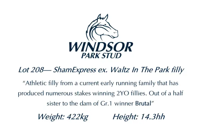 SHAMEXPRESS (NZ) (Bay 2009-Stud 2014). 3 wins-1 at 2-to 1200m, VRC Newmarket H., Gr.1. Leading NZ First Season Sire in 2017-18. Sire of 100 rnrs, 51 wnrs, inc. SW Embrace Me (MVRC Typhoon Tracy S., Gr.3), Cyber Attack, London Express, Qiji Express - Happy Qiji (H.K.), SP Diva Express and of Hard Press, Dune Field, Bothered, Coventina Bay, Dor Dor, Express Dreams, Express Fantasy, Fairy Me Home, Gunga Din, Tiny Terror, etc. 1st dam WALTZ IN THE PARK, by Thorn Park. Placed at 3 in NZ and Aust. Sister to TE AKAU ROSE, three-quarter-sister to ALBERTON PARK, MAGIC BRIAR, half-sister to Alberton Princess (dam of BRUTAL, TALARIA), Dancing Bridges (dam of TESTARHYTHM), Alberton Rose (dam of CAVALRY ROSE). This is her sixth foal. Dam of four foals to race, two winners- Beerinawineglass (f. by Mastercraftsman). Winner at 1400m, 2d BRC Doomben 10000 P. Yulong Express (g. by Shamexpress). Winner at 1200m in Singapore. Switch Play (c. by Shamexpress). Placed at 2 in 2019-20, 3d ATC Too Darn Hot at Darley 2YO H. Shammgod (f. by Shamexpress). Placed at 3 in 2019-20 in Aust. 2nd dam STRAUSSBRIDGE, by Straussbrook. 2 wins at 2 at 1000m, Counties Challenge S., L. Half-sister to ALBERTON STAR (dam of LADY ALBERTON, ALBERTON PARK), SIR ALBERTON, Alberton Magic (dam of MAGIC BRIAR). Dam of 9 foals, 8 to race, 6 winners, inc:- TE AKAU ROSE (Thorn Park). 3 wins-2 at 2-at 1200m, NZ$131,335, Matamata Breeders' S., Gr.2, 2d Taranaki 2YO Classic, Gr.3, CJC Canterbury Belle S., L, Wanganui JC Fillies' S., L. Dam of 5 winners- Wassergeist (Fastnet Rock). 4 wins at 1200m, 1400m in Aust. and Singapore, MRC Chandler Macleod P., 3d MRC Gothic S., L. Shapita (Foxwedge). 3 wins-1 at 2-at 1100m, 1200m, A$91,790, WATC Yellowglen H., 2d WATC Placid Ark S., L, 4th WATC Burgess Queen S., L. Alberton Princess (Golan). 2 wins at 1400m, Counties RC Briscoes Pukekohe H., 3d Taranaki 2YO Classic, Gr.3. Dam of 4 winners- BRUTAL (O'Reilly). 5 wins-1 at 2 and 3 in succession-1200m to 1600m, A$2,632,150, to 2019-20, ATC Doncaster H., Gr.1, Premiere S., Gr.2, VRC Antler Luggage P., L, MVRC Mitchell McKenzie S., L, MRC Ladbrokes.com.au 2YO H., 2d ATC George Ryder S., Gr.1, 3d ATC Sydney S., Gr.3, Southern Cross S., Gr.3. TALARIA (O'Reilly). Winner at 2 at 1100m, Counties RC Murdoch Newell S., L. Dancing Bridges (Danske). Winner at 2 at 1200m, STC Vodka Cruiser 2YO H., 2d AJC Reginald Allen H., L, 3d AJC TL Baillieu H., L. Dam of- TESTARHYTHM (Testa Rossa). 5 wins-1 at 2-1200m to 1350m, A$342,250, Gosford RC Takeover Target S., L, ATC Latch-On Education Program H., Perfection Fresh H., 3d STC Run to the Rose H., Gr.3. Alberton Rose. 3 wins at 1200m, Waikato RC Ready to Run Sale H. Dam of- CAVALRY ROSE (Charge Forward). 3 wins-2 at 2-at 1200m, A$437,750, MRC Thoroughbred Club S., Gr.3, ATC Inglis 2YO Classic, 2d ATC Magic Night S., Gr.2, 4th MVRC Red Anchor S., Gr.3, ATC Reginald Allen H., L, Canberra RC Black Opal S., L. Producer. |