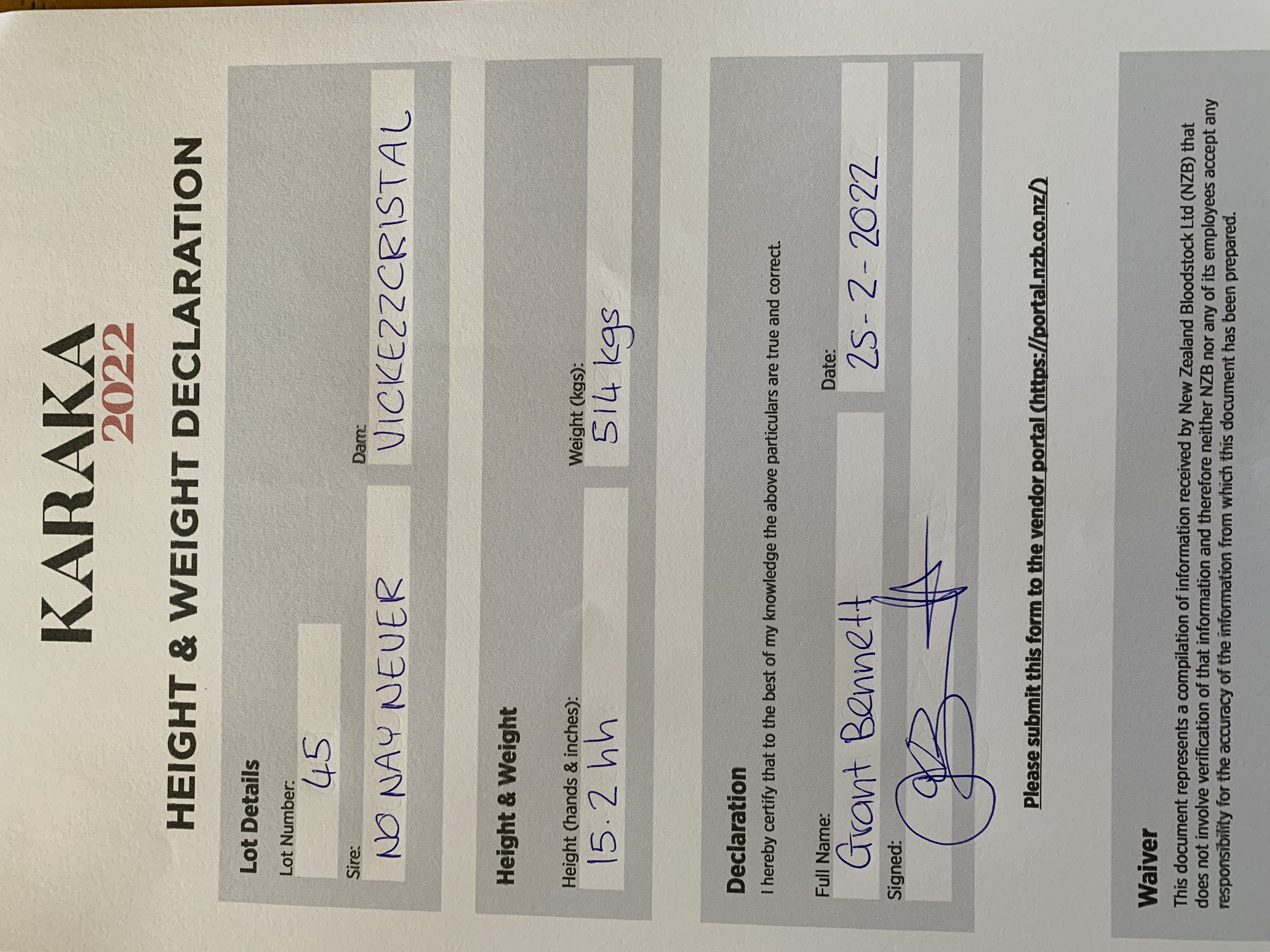 NO NAY NEVER (USA) (Bay 2011-Stud 2015). 4 wins-3 at 2, Deauville Prix Morny, Gr.1. Leading First Season Sire in GB/Ire. in 2018. Sire of 416 rnrs, 234 wnrs, 35 SW, inc. SW Ten Sovereigns (Newmarket Middle Park S., Gr.1), Alcohol Free, Brooke, Need I Say More, Chestnut Honey, Nay Lady Nay, Zain Claudette, Shadn, Wichita, Land Force, Mana Nui, Arizona, Mystery Power, Nikisophia, Armor, Love Locket, Vitalogy, Servalan, etc. 1st dam VICKEZZCRISTAL, by Big Brown. Unplaced. Half-sister to (Oh So) Splendido. This is her third foal. Her second foal is an unraced 3YO. Dam of one foal to race. 2nd dam VICKEZZCHARDONNAY, by Don Eduardo. 5 wins 1600m to 2100m, NZ$210,377, Taranaki Cup, Gr.3, ARC Ashford Lodge H., 2d CJC Warstep S., L, ARC Lindauer Cuvee Riche H., 3d New Zealand Cup, Gr.2, ARC Ellerslie Oaks, Avondale JC York Cup, 4th Auckland Cup, Gr.1, Wellington Cup, Gr.2, Cambridge JC Travis S., Gr.2, Rotorua Cup, Gr.3. Three-quarter-sister to Balham, half-sister to THE MIGHTY FINN, FIFTY FIFTY. Dam of 7 named foals, 6 to race, 3 winners, inc:- (Oh So) Splendido (O'Reilly). 2 wins at 2100m, 2d ARC 3YO Salver, L, Barfoot & Thompson H., Vertical Logistics H., Rutherford Rede H. Aromatic. 3 wins in succession at 1400m, 1600m to 2020-21, Matamata RC Matamata Veterinary Services H., 2d Counties RC HR Fisken and Sons H. 3rd dam OUR ROSALEE, by Conquistarose. Unplaced. Half-sister to MISS EMMA, Silver Scout. Dam of 13 foals, 10 to race, 8 winners, inc:- THE MIGHTY FINN (McGinty). 8 wins 1000m to 2100m, NZ$146,150, S$423,464, Counties Cup, Gr.2, Avondale JC Sheriff H., Singapore TC Jumbo Jet H., Class 1 H., ARC Lanvin H., Avondale JC Vegie World H., Taranaki RC NRM Interprovincial H., 2d ARC Great Northern Challenge S., Gr.3, WRC Anniversary H., L, Singapore TC Queen Elizabeth II Cup, L, 3d ARC Easter H., Gr.1, 4th Singapore Gold Cup, L. VICKEZZCHARDONNAY (Don Eduardo). 5 wins. See above. FIFTY FIFTY (Justice Prevails). 6 wins-2 at 2-800m to 2000m, NZ$108,425, BOP RC Tauranga Classic, L, Cambridge JC Deputy Governor Trophy, Counties RC Premier Bankers H., Wanganui JC Ellerslie Summer Carnival Juvenile H., 2d WRC Wakefield Challenge S., Gr.3, 4th Waikato RC Instrument Supplies S., Gr.3, Manawatu Classic, Gr.3. Dam of- Balham (Don Eduardo). 6 wins 1600m to 2500m, NZ$191,607, Waikato RC Fairview Motors H., Waverley Cup, Hawkes Bay Betavet H., Cambridge JC Guild & Spence Electrical H., 2d Manawatu Cup, Gr.3-twice, 3d Hawke's Bay Gold Cup, L, Feilding Gold Cup, L-twice, Wanganui Cup, L. 4th dam MY HASSLE, by Namnan. 4 wins-2 at 2-at 800m, 1110m, 2d QTC Novice H., 3d BATC Novice H., QTC Novice H. Dam of 11 foals, 10 to race, 5 winners, inc:-
