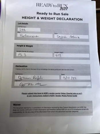 PREFERMENT (NZ) (Bay 2011-Stud 2017). 5 wins from 2000m to 2500m, Victoria Derby, Gr.1, ATC BMW S., Gr.1, VRC Australian Cup, Gr.1, Turnbull S., Gr.1. Brother to SW Rezoned. Sire of SP Smirk, Tap Dancer and of Canny Man, Legatus, Cosmo Appeal, Horace, Prefer Us, Enraptured, Prefer to be Ready and of the placegetters Musgrave, Baguio, Cherokee Cherry, Embossing, Isometric, Like it Sweet, Maria, Rocket Lad, etc. 1st dam Stylish Attack, by Tavistock. 4 wins at 1600m, Avondale JC West Brook Winery H., BOP RC Vertical Horizonz Group H., 2d WRC Cuddle S., Gr.3, BOP RC Crockford Real Estate H., Waikato RC The Edge 97.8 FM H., Punter Challenge 5th Nov H., 3d ARC Eagle Technology S., Gr.3, Matamata RC Tonezone H. Half-sister to YOUSINGWEDANCE, Stacked (dam of VELADERO). This is her second foal. Her first foal is an unraced 3YO. 2nd dam WESTERN INVASION, by Best Western. Unraced. Half-sister to Kind Lady (dam of FLUSHED). Dam of 11 foals, 9 to race, 7 winners, inc:- YOUSINGWEDANCE (Danasinga). 3 wins at 1600m, 1700m in Malaysia, Penang TC Dr Lim Ah Soo Memorial Trophy, L. Stylish Attack (Tavistock). 4 wins. See above. Lindalay. 6 wins-3 in succession-1200m to 1500m, BTC XXXX Gold H. Dam of- Oompa Loompa - Happy Bao Bei (H.K.). 9 wins at 1200m, 1300m, A$237,360, HK$4,130,075, ATC Narellan Town Centre H., HKJC Cannon H. Stacked. 4 wins-3 in succession-1150m to 1400m, A$183,150, AJC Last Post H., Bacardi Breezer H., STC Sunbeam Dried Fruit & Nut H. Dam of- VELADERO (Medaglia d'Oro). 5 wins-3 in succession-1400m to 1800m, NZ$20,275, A$415,630, ATC Gloaming S., Gr.3, McGrath Estate Agents H., Theraces H., CJC Energy Events Centre H., 2d ATC Frank Packer P., Gr.3, 3d ATC Carbine Club S., Gr.3, BRC Rough Habit P., Gr.3, 4th ATC Spring Champion S., Gr.1, Moonee Valley Vase, Gr.2. 3rd dam COME ON LADY, by Comeram. 3 wins-2 at 2-1200m to 1600m, AJC Fernhill H., L, 2d South Australian Oaks, Gr.1, 3d AJC Surround S., Gr.3, Geelong RC Oaks Trial S., L, 4th AJC Gimcrack S., Gr.3, STC Reisling Slipper Trial H., Gr.3, AJC Silver Shadow S., L. Half-sister to STOCKWELL LASS, VEE FOR VICTORY, Sea Change (dam of BESERK), Foster's Girl (dam of SILKY DANCER). Dam of 6 named foals, 4 to race, 3 winners, inc:- Kind Lady. 2 wins at 1250m, 1500m, STC Computer Services P. Dam of- FLUSHED (Redding). 6 wins 1300m to 2000m, A$316,050, MVRC Sunline S., Gr.2, VRC Matriarch S., Gr.3, Let's Elope S., L. Dam of 5 winners- Bold Moment (Fasliyev). 2 wins at 1000m, 1200m, A$96,250, 3d VRC Red Roses S., L, MRC Twilight Glow S., L. Dam of 4 winners- Labdien (Stryker). 3 wins-1 at 2-1000m to 1300m, A$199,460, ATC McGrath Estate Agents H., 2d MVRC Alexandra S., Gr.3. Vivid Diamonte. Raced twice. Dam of- MAJESTIC COLOUR (So You Think). 4 wins in succession 1400m to 1700m, A$177,900, in 2021-22, SCTC Winx Guineas, Gr.3. Making Believe. Placed at 2, 2d AJC GT Rowe 2YO H. Grandam of- THE INVENTOR (Danasinga). 6 wins 1630m to 2200m, A$264,785, Qld Tatt's RC Tattersall's Cup, Gr.3, BRC Ord Minnett H. |