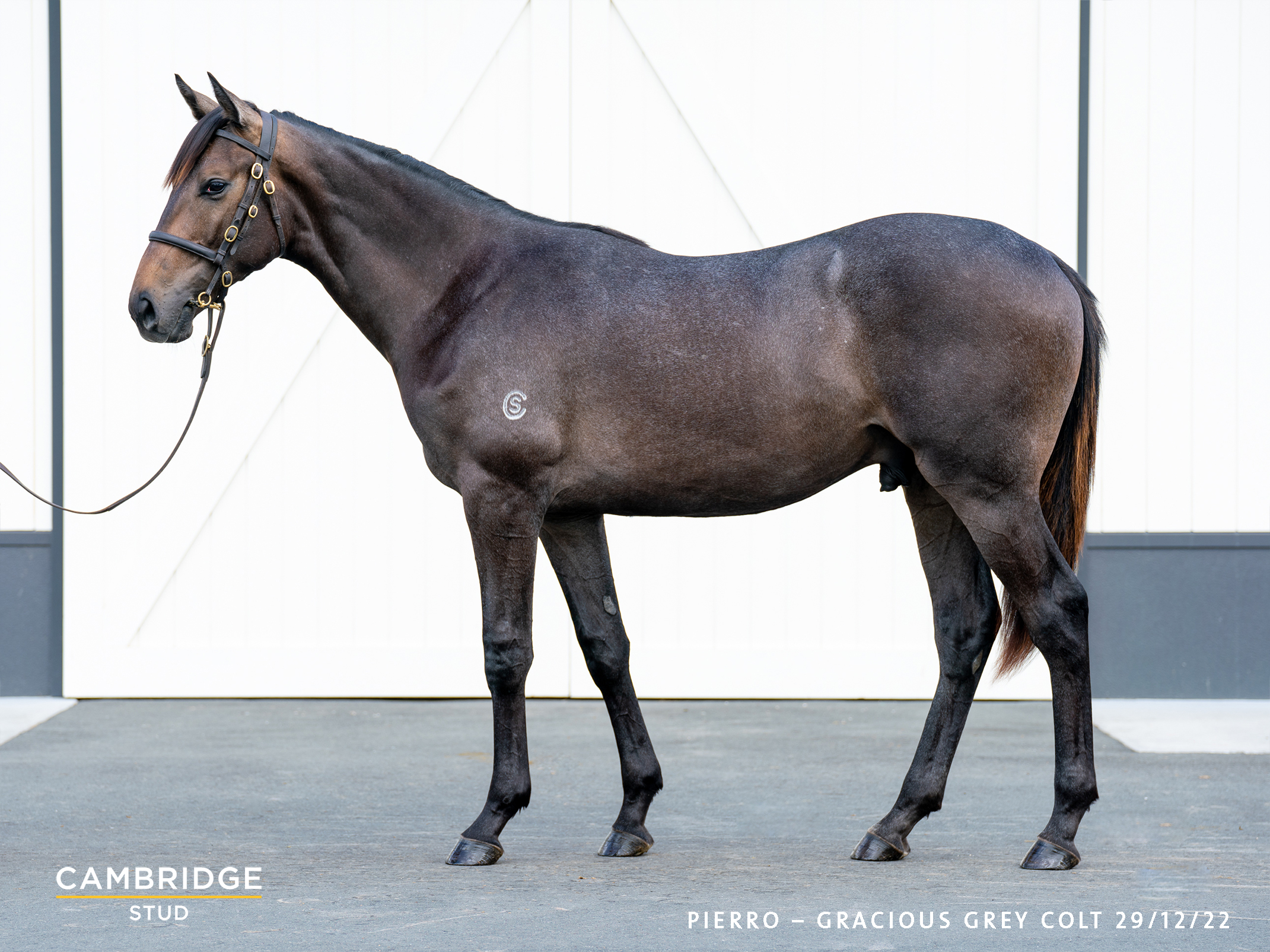 PIERRO (AUS) (Bay 2009-Stud 2013). 11 wins-6 at 2, ATC Golden Slipper S., Gr.1. Leading First Season Sire in Aust. in 2016-17. Sire of 491 rnrs, 329 wnrs, 31 SW, 6 G1 wnrs, inc. SW Levendi (ATC Australian Derby, Gr.1), Arcadia Queen, Regal Power, Shadow Hero, Pierata, Pinot, Furore, Dragon Leap, Paris Dior, Reelem in Ruby, Action, Roy Had Enough, Rock, Tulip, Bellevue Hill, Gamay, Persan, Rocha Clock, Parry Sound, etc. 1st dam GRACIOUS GREY, by Redoute's Choice. 2 wins at 1400m, 1600m, 2d ATC Hyland Race Colours P., 3d ATC Hyland Race Colours H. Three-quarter-sister to POSITIVE PEACE, Rotator, Alkaashef. This is her third foal. Her second foal is a 2YO. Dam of one foal to race- Grace 'n' Grey (f. by Spirit of Boom). Winner at 2 at 1100m in 2021-22, Auckland TR Civic Contractors 2YO S., 2d CJC Murray Gillanders Memorial S. 2nd dam WARPATH, by Reset. 7 wins-4 in succession-1200m to 1900m, A$219,480, ATC Aspiration H., L, AJC New Years Day at Randwick H., McGrath Estate Agents H., STC Rosehill Gardens Event Centre H. Half-sister to Limerock (dam of LIMESTONE). Dam of 7 named foals, 6 to race, all winners, inc:- POSITIVE PEACE (Stratum). 9 wins-5 in succession-1200m to 1550m, A$565,715, ATC Emancipation S., Gr.2, Nivison S., Gr.3, Sharp Extensive it H., Cerrone H., Sky Racing Active H., Heineken 3 H., 3d ATC Hot Danish S., Gr.2, 4th ATC Golden Pendant, Gr.2. Rotator (Not a Single Doubt). 3 wins 1000m to 1200m, A$153,950, BRC TAB Venue Mode H., 2d ATC Widden S., Gr.3, Southern Cross Turf 2YO H. Alkaashef (Stratum). Winner at 2 at 1200m, 3d VRC UCI S., L. Waruna. 4 wins 1100m to 1550m, A$101,710, ATC TAB Rewards H. Calcareous. 2 wins at 1100m, 1600m to 2022-23 in Aust. 3rd dam ONLY VANDA, by Linamix. 3 wins 1200m to 1900m, STC Gulf Station H., 2d AJC Le De'Jeuner H. Half-sister to THE KEY RAINBOW, Tedarshana (dam of HONORIA), Tekindia (dam of WADE GILES - DESTINED FOR GLORY (H.K.)). Dam of 12 named foals, all raced, 7 winners, inc:- WARPATH (Reset). 7 wins. See above. Limerock. 5 wins-3 in succession-1200m to 1440m, A$148,528, MRC Taralye Cup, VRC Hilton Nicholas H., MRC American Car Parts H. Dam of- LIMESTONE (Helmet). 2 wins at 2 at 1000m, A$279,350, MRC Blue Diamond Preview (f), Gr.3, VRC New Year 2YO P., 2d MRC Blue Diamond Prelude (f), Gr.2, 4th VRC Coolmore Stud S., Gr.1. 4th dam TE KANI, by Northern Dancer. Placed at 3 in France. Half-sister to OGYGIAN, LOOKINFORTHEBIGONE, Diggings, Gone Private (dam of QUE PASO), Fair to All (dam of HONOUR AND GLORY), Katie Love (dam of TIMELESS LOVE). Dam of 8 named foals, all raced, 7 winners, inc:- THE KEY RAINBOW (Rainbow Quest). 5 wins at 2011m, 2400m, 251,600fr., US$278,008, Santa Anita Astray S., L, 3d Santa Anita San Fernando S., Gr.2. Tekindia. Winner at 1508m, 3d Saint-Cloud Prix de l'Ermitage. Dam of-