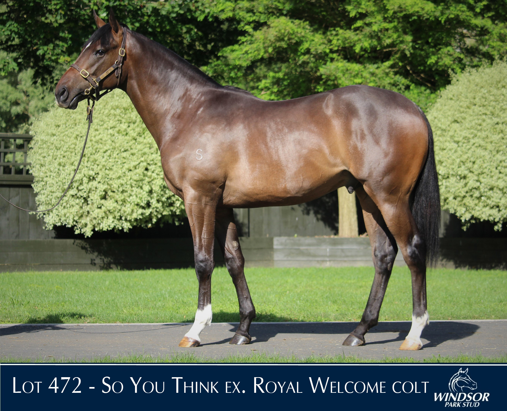 SO YOU THINK (NZ) (Bay or Brown 2006-Stud 2012). 14 wins-1 at 2, MVRC WS Cox P., Gr.1-twice. Sire of 742 rnrs, 506 wnrs, 46 SW, 9 G1 wnrs. His SH-bred progeny inc SW Quick Thinker (ATC Australian Derby, Gr.1), La Diosa, Think it Over, Nimalee, Nakeeta Jane, Sopressa, D'Argento, Inference, Fasika, Peltzer, Midnight Blue, etc. His NH-bred progeny inc SW Knights Order, Coachwhip, Mr Marathon Man, Think of Me, etc. 1st dam ROYAL WELCOME, by Kingman. Placed at 3 in GB. Half-sister to HADDAF, LAMAR. This is her first foal. 2nd dam Deveron, by Cozzene. Winner at 2 at 7f, Goodwood New Ham 2YO Fillies S., 2d Newmarket Brackett Green 2YO Fillies S., 3d Longchamp Prix Marcel Boussac, Gr.1, Newmarket Sweet Solera S., Gr.3. Sister to WINDWARD ISLANDS, half-sister to HUNTER CRUISE. Dam of 11 named foals, all raced, 8 winners, inc:- HADDAF (Dawn Approach). 9 wins-1 at 2-995m to 1700m to 2022 in GB and Spain, Sandown Scurry S., L, Bet365 H., Newcastle Betfred Sky Sports 2YO S., 3d Sandown National S., L, Vichy Prix des Reves d'Or, L. LAMAR (Cape Cross). 6 wins-1 at 2-6f to 9½f, £149,083, €5,200, Lingfield Fleur de Lys S., L, Ladbrokes S., Newmarket 2YO Fillies' S., 2d Lingfield Winter Derby Trial, L, Fleur de Lys S., L, 3d Goodwood Festival S., L, Sandown Star S., L, Lingfield Winter Derby Trial, L, Quebec S., L, 4th Newmarket Nell Gwyn S., Gr.3, Deauville Prix Miss Satamixa, L. Dffar. Winner at 2 at 7f, Doncaster Simpsonmillar.co.uk Solicitors 2YO S. Cloudbreaker. Winner at 2 at 7f in 2022 in GB. He's a Dream. Winner at 1900m in 2021-22 in Qatar. Open Letter. Winner at 2 at 1m in GB. Dam of- London Bound. 4 wins-1 at 2-1100m to 1340m, Waikato RC Win Group 2 Waikato Guineas 2YO H., 4th CJC Canterbury Breeders S., Gr.3. 3rd dam CRUISIE, by Assert. 3 wins at 8½f, 4th Arlington Park Pucker Up S., Gr.3, Sickle's Image S., L. Half-sister to DULUTH, REAL COURAGE, I REALLY WILL, RYTHMICAL (dam of CAPOTE BELLE), Car Gal. Dam of 9 foals, 8 to race, 7 winners, inc:- WINDWARD ISLANDS (Cozzene). 6 wins-1 at 2-8½f to 9½f, US$847,098, Woodbine Nijinsky S., Gr.2-twice, Toronto Cup, L, Keeneland Allowance, 2d Woodbine Sky Classic S., Gr.2, Fair Grounds H., Gr.3, 3d Woodbine Northern Dancer Turf S., Gr.1, Sky Classic S., Gr.2, Keeneland Elkhorn S., Gr.2, Woodbine Singspiel S., Gr.3, 4th Woodbine Nijinsky S., Gr.2. HUNTER CRUISE (Capote). 3 wins in succession at 2 at 1m, Monmouth Continental Mile S., L, 4th Aqueduct Pilgrim S., L. Deveron (Cozzene). Winner. See above. Ceo Sis. 2 wins at 6f, 1m in U.S.A. Grandam of- Acerina (Slaytheodds). 5 wins 1100m to 1800m in Venezuela, 2d La Rinconada Clasico Lavandera, L. Captiva. Raced once. Grandam of-