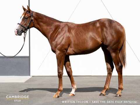 WRITTEN TYCOON (AUS) (Chestnut 2002-Stud 2007). 2 wins at 2, STC Todman Slipper Trial S., Gr.2. Champion Sire in Aust. in 2020-21. Sire of 1004 rnrs, 765 wnrs, 52 SW, 12 G1 wnrs, inc. SW Capitalist (ATC Golden Slipper S., Gr.1), Ole Kirk, Written By, (La) Luna Rossa, Pippie, Tycoon Tara, Music Magnate, Coolangatta, Despatch, Booker, Tyzone, Odeum, Kissonallforcheeks, Howmuchdoyouloveme, Super Cash, Rich Enuff, etc. 1st dam Save the Date, by Savabeel. 4 wins at 1200m, 1400m, ARC Mondiale H., Waikato RC Yardhouse H., 2d ARC Delta Insurance H., Avondale JC Jones & Co Lawyers H., Counties RC Fasttrack Insurance H., 3d Waikato RC J Swap Contractors Sprint H., Gr.3. This is her second foal. Her first foal is a 2YO. 2nd dam MORE TO LOVE, by Danasinga. Winner at 1400m, 2d Hawkes Bay City of Hastings H. Sister to FORUM FLOOZIE (dam of LAWSPEAKER), half-sister to STARCRAFT, Pin Up (dam of SPORTS ILLUSTRATED). Dam of 7 named foals, 5 to race, 4 winners, inc:- Save the Date (Savabeel). 4 wins. See above. Together. 2 wins at 1300m, 1400m, Matamata RC The Meat Co Matamata H., 2d ARC PGG Wrightson and Vetmed H., BOP RC Team Wealleans H. Nigella. Unraced. Dam of 2 winners- Sacred Pearl. 2 wins at 1400m in 2021-22, WRC Trentham Gold Cup, 2d Hawkes Bay Coombe Smith Rangitikei H., Per Incanto's Lot 330 H. 3rd dam FLYING FLOOZIE, by Pompeii Court. Placed at 3, 3d Waikato RC Caribou H. 2004, 2005 & 2006 NZ Broodmare of the Year. Sister to HAPPY HEIRESS (dam of HAPPY HARRIET, HAPPY LAND), Bed of Roses (dam of GWENDOLYN), three-quarter-sister to Zeffi (dam of CENTURY KID), half-sister to ZEPHYR MAGIC (dam of DAHLIA'S LEGACY, BREEZY, NEO STAR). Dam of 6 foals, all winners, inc:- STARCRAFT (Soviet Star). Champion 3YO in Australia. Champion Older Sprinter in NZ. Champion Older Male Miler in France & GB. 11 wins-5 in succession-1400m to 2400m, Australian Derby, Gr.1, AJC Chipping Norton S., Gr.1, Newmarket Queen Elizabeth II S., Gr.1, Prix du Moulin de Longchamp, Gr.1, (1600m course record), Hawkes Bay Mudgway Partsworld S., Gr.1, STC Tulloch S., Gr.2, Hawkes Bay Stoney Bridge S., Gr.2, VRC Debonair S., Gr.3, 2d Hawkes Bay Kelt Capital S., Gr.1, VRC Australian Guineas, Gr.1, 3d MVRC WS Cox P., Gr.1. Sire. FORUM FLOOZIE (Danasinga). 5 wins 1200m to 1550m, A$478,530, AJC Wiggle H., L, 2d STC Coolmore Classic, Gr.1, MRC Tristarc S., Gr.3, STC Research S., Gr.3, 3d AJC Epsom H., Gr.1, STC Coolmore Classic, Gr.1, AJC Bill Ritchie H., Gr.3, Breeders' Classic, L. Dam of 4 winners- LAWSPEAKER (Singspiel). 3 wins at 2400m, Toulouse Grand Prix Inter-Regional des 3 Ans, L, Bordeaux Derby du Midi, L. Pin Up (Pins). 3 wins at 1200m, 1400m, A$164,800, VRC True Course H., 2d VRC Matriarch S., Gr.2, Maybe Mahal P., L. Dam of 4 winners-