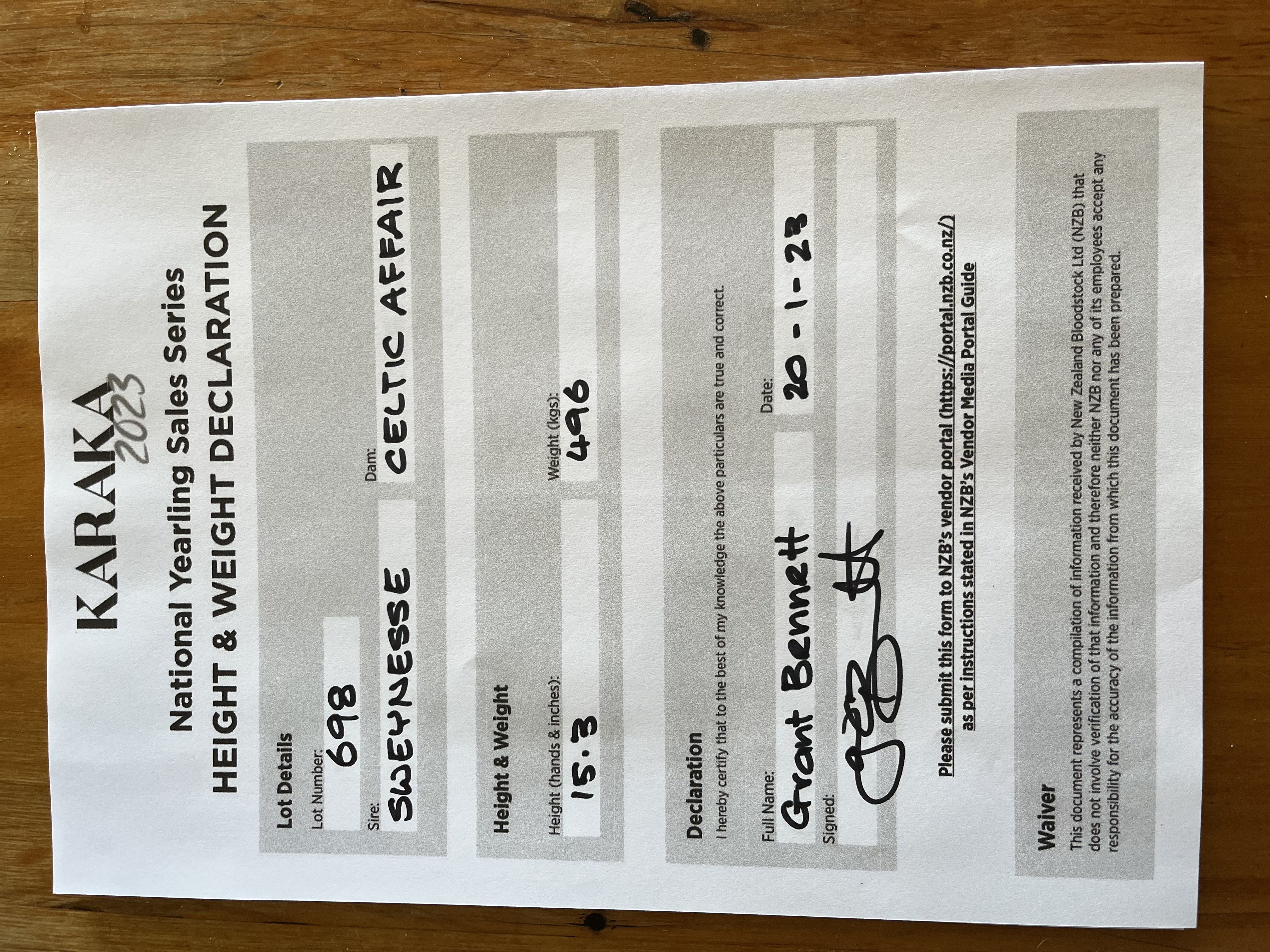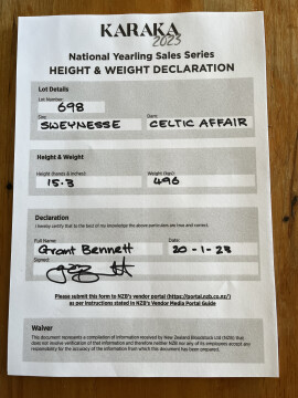 SWEYNESSE (AUS) (Bay or Brown 2011-Stud 2016). 4 wins-1 at 2, ATC Gloaming S., Gr.3. Leading First Season Sire in NZ in 2019-20. Sire of 104 rnrs, 41 wnrs, inc. SW Only Words (BRC The Roses, Gr.2), Dragon Queen, Bonita Aurelia, Brix, SP Lucky Sweynesse, Explosively - Solid Impact (H.K.), Signora Nera, Beau Rouge and of Astrakhan, Ciambella, Orlov, Petty's Legacy, Treybon, Walkthisswey, Carribean King, Fly My Wey, etc. 1st dam CELTIC AFFAIR, by Sebring. Unraced. This is her first living foal. 2nd dam IRISH FLING, by Darci Brahma. 5 wins at 1000m, 1200m, NZ$214,875, WRC Telegraph H., Gr.1, CJC Pegasus S., L, 3d CJC Stewards S., Gr.3, 4th ARC Darley P., Gr.3, Hawkes Bay Tumu ITM Spring Sprint H., Gr.3. Dam of 5 named foals, 3 to race, 2 winners, inc:- Viking. Winner at 1200m, 2d ARC Barfoot & Thompson H. 3rd dam Irish Belle, by O'Reilly. 5 wins 1000m to 1400m, 2d CJC Great Easter S.H., L, Otago RC Otago Breeders' S., L, 4th Avondale JC Concorde H., Gr.2, Waikato RC Sprint H., L. Three-quarter-sister to FINAL DESTINATION (dam of FINAL FORM), Irish Edition (dam of ORATOR'S DAUGHTER), half-sister to SOCIETY BEAU, SANDBLASTER, Zamfir. Dam of 9 foals, all raced, 4 winners, inc:- IRISH FLING (Darci Brahma). 5 wins. See above. Enthusabelle. Placed at 2, 3d Wanganui JC Ford 2YO S. Dam of 2 winners- Pipiana (Highly Recommended). 2 wins at 1200m, 1250m, 3d Otago RC Otago Breeders' S., L, Gore Guineas, L. 4th dam SOCIETY BAY, by Zephyr Bay. 6 wins-2 at 2-1200m to 1600m, NZ$106,525, A$264,350, VRC Edward Manifold S., Gr.2, MVRC Veuve Clicquot S., Gr.2, Waikato RC Noble Heights S., Gr.3, Otaki Maori RC WFA S., L. Half-sister to Beau Bacchus, Lancaster, Sacaya (dam of DUANETTE'S GIRL), The Pact, (My) Vanity (dam of REDDLAN), Aranda (dam of BEAU ZEPHYR). Dam of 11 foals, 10 to race, 8 winners, inc:- SOCIETY BEAU (Bigstone). 12 wins-3 in succession-1200m to 2020m, NZ$177,062, A$85,000, BOP RC Japan-New Zealand International Trophy, Gr.2, BTC Chairman's H., Gr.3, 2d Manawatu Challenge S., Gr.3. SANDBLASTER (Sandtrap). 6 wins 1150m to 1400m, NZ$120,475, A$7,500, Waikato RC Sprint H., L, ARC Leila Macdonald H., 2d Counties Bowl, L. Rezidencia. 2 wins at 1400m, 2040m, MVRC AMS Law H. Grandam of- TYZONE (Written Tycoon). 17 wins-4 at 2 and 4 in succession-950m to 1400m, A$1,228,425, BRC Stradbroke H., Gr.1, BRC Sprint H., Gr.3, GCTC Goldmarket H., L, 2d BRC Stradbroke H., Gr.1. Logical Lady. Winner at 1200m. Dam of 8 winners- FINAL DESTINATION (O'Reilly). Champion 3YO Miler in NZ in 2001-02. 5 wins in succession 1400m to 1709m, New Zealand One Thousand Guineas, Gr.1, Levin RC Bayer Classic, Gr.1. Dam of 6 winners- FINAL FORM (Deep Impact). 3 wins at 1600m, 1800m, Fukushima Radio Nikkei Sho, Gr.3, 2d Tokyo Saudi Arabia Royal Cup Fuji S., Gr.3. |