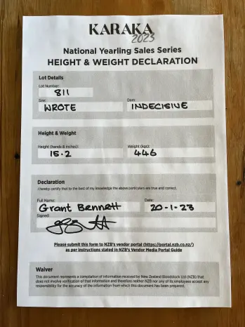 WROTE (IRE) (Bay 2009-Stud 2014). 3 wins at 2, Breeders' Cup Juvenile Turf S., Gr.1. Sire of 108 rnrs, 51 wnrs, inc. SW Best Seller (Hawkes Bay Gold Trail S., Gr.3), SP Love Letter, High Providence and of Sotirio, Wrote to Arataki, And We Danced, Robbie Burns, Vincero, Black Riddle, Freelance, Highly Noted, Notes, Typewritten, Wrote in Stone, Afandi, El Solitario, Sir Terre, Colosal, High Class Player, Manos Blancas, etc. 1st dam INDECISIVE, by Pins. Unplaced. Three-quarter-sister to Sacred Pins, half-sister to SURELY SACRED - SUPER OASIS (H.K.), BETWIXT (dam of PROVOCATIVE), Sure You Can (dam of EL PATRONESS). This is her seventh foal. Her sixth foal is a 2YO. Dam of three foals to race, inc:- Sacred Thoughts (f. by Sacred Falls). 3 wins 1000m to 1106m to 2021-22 in Aust. Sacred Bourbon (g. by Sacred Falls). Placed to 2022-23. 2nd dam NOT SURE, by Masterclass. 5 wins 1300m to 2000m, Waikato RC Pencarrowstud.co.nz H., Wallace Construction H. Half-sister to TAUPO RETREAT. Dam of 9 named foals, 8 to race, 5 winners, inc:- SURELY SACRED - SUPER OASIS (H.K.) (Rock 'n' Pop). 6 wins 1200m to 2100m, NZ$183,400, A$223,000, HK$5,416,400, to 2021-22, ARC Avondale Guineas, Gr.2, Auckland Guineas, Gr.2, HKJC HK Racehorse Owners H., Huangcun Sports Training H., 2d ARC Bonecrusher S., Gr.3, 3d ATC Australian Derby, Gr.1, 4th ATC Rosehill Guineas, Gr.1. BETWIXT (O'Reilly). 3 wins 1600m to 2200m, Tasmanian Derby, Gr.3. Dam of- PROVOCATIVE (Zabeel). 4 wins 1400m to 2400m, NZ$19,400, A$332,800, BRC Queensland Oaks, Gr.1, Ipswich Cup Marquees H., ARC League 4 Life Foundation H. Dam of- Grinzinger Lord (Tavistock). Placed at 3, 3d VRC TAB Trophy, L. Sure You Can. 3 wins at 1612m, 2000m, A$202,470, VRC Dover H. Dam of- EL PATRONESS (Shamus Award). 2 wins at 1800m, 2400m, A$925,200, in 2021-22, ATC Australian Oaks, Gr.1, VRC Super Impose S., L, 2d MRC Caulfield Classic, Gr.3, 3d MRC Autumn Classic, Gr.2. Stockpin. Placed in NZ and Aust. Dam of 2 winners- Florent. 3 wins 1500m to 2000m, A$433,965, MRC VOBIS Sires Guineas, 2d MRC Foundation H., 4th BRC The Roses, Gr.2. 3rd dam ICELETTE, by Icelandic. 8 wins 1250m to 2000m, NZ$104,220, Manawatu RC Sprint H., L, Higgins Mile H., L, Rangitikei Gold Cup, 2d Te Aroha JC New Zealand Thoroughbred Breeders' S., Gr.2, 3d WRC Thompson H., Gr.3. Half-sister to STARDETTE. Dam of 8 foals, 5 to race, 4 winners, inc:- TAUPO RETREAT (Centaine). 9 wins-1 at 2 and 3 in succession-1400m to 2000m, Gosforth Park November H., Gr.1, Kenilworth Selangor Cup, Gr.2. Ice Frantic. 4 wins at 1200m, 1400m, 2d CJC Bankprint H. Dam of 5 winners- Coat of Arms (Coats Choice). 6 wins 1200m to 1600m, 2d Gore Guineas, L. Fru Ju. Unraced. Dam of 2 winners- Bully Boy (Rock 'n' Pop). 7 wins 1400m to 2100m, 3d Wanganui Cup, L. Hideaway. Unraced. Dam of 4 winners- Sacred Pins (Pins). 3 wins in succession at 1200m, A$102,900, S$9,281, ATC Schweppes H., De Bortoli H., 2d ATC South Pacific Classic, L. |