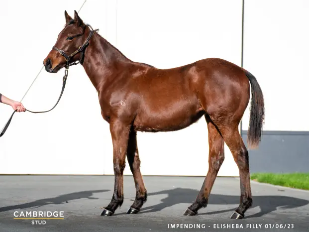 IMPENDING (AUS) (Bay 2013-Stud 2018). 5 wins-1 at 2, BRC Stradbroke H., Gr.1. Three-quarter-brother to SW Lyre. Sire of 86 rnrs, 31 wnrs, inc. SW Impendabelle (WRC Wakefield Challenge S., Gr.2), SP Hope at Hand, Running By, Moko and of Russian Dancer, Forecaster, Happy for All, Scorch, Shadow Vampire, Sir Bailey, Wakanjeja, Watch the Clock, Bold Instinct, Kin, She's Imminent, etc. His oldest progeny are 3YOs. 1st dam ELISHEBA, by Australia. Winner at 9½f, 4th Lingfield Oaks Trial S., L. Three-quarter-sister to PLATINUM WARRIOR, Hadrianus. This is her second foal. Her first foal is a yearling. 2nd dam LAUGH OUT LOUD, by Clodovil. 4 wins at 1610m, £58,967, €79,800, US$24,000, Chantilly Prix de Sandringham, Gr.2, York Michael Seely Memorial S., L, Kempton Betfred Fillies' S., 3d Newmarket Sun Chariot S., Gr.1, Saratoga De La Rose S., L, 4th Leopardstown Matron S., Gr.1. Half-sister to SUZI'S DECISION, Baghdad, Nadinska (dam of PLAINCHANT). Dam of 7 named foals, 5 to race, 4 winners, inc:- PLATINUM WARRIOR (Galileo). 3 wins-1 at 2-at 1m, 1¼m, Santa Anita San Marcos S., Gr.2, Curragh Gallinule S., Gr.3, 4th Arlington Park Secretariat S., Gr.1, Leopardstown Derrinstown Stud Derby Trial S., Gr.3. Hadrianus (Galileo). Winner at 2 in 2022, 2d Epsom Blue Riband Trial, L.. Pons Aelius. 4 wins 1½m to 2m in 2022, 3d Haydock Get Daily Rewards With Betfair H. FUNNY GIRL, by Darshaan. Placed, 2d Newbury Espeed S. Dam of 12 foals, 10 to race, 9 winners, inc:- LAUGH OUT LOUD (Clodovil). 4 wins. See above. SUZI'S DECISION (Act One). 6 wins-1 at 2-6f to 1½m, Newbury Chalice S., L, Haydock Pinnacle S., L, Newbury Tadley Rugby Club H., 3d York Skybet.com H. Baghdad (Frankel). 5 wins-1 at 2-1¼m to 1½m, £182,425, QAR13,800, Royal Ascot King George V S., Duke of Edinburgh S., Newmarket Qatar Racing H., York Cystic Fibrosis Care H., 3d Goodwood Glorious S., Gr.3. Pippa Greene. 5 wins-3 in succession-1¼m to 18½f, Newbury Mirage Signs H., Ascot Casino at the Empire H., Leicester Quorn H. Brynfa Boy. 3 wins at 5f, Epsom Totesport.com H. Euthenia. Winner at 6f, 3d Ascot Kelly Group Fillies' Nursery H. Dam of- Grayscale. 2 wins at 2 at 1500m, 1800m, Roma Premio Blow. Nadinska. Winner at 5¾f in GB. Dam of 3 winners- PLAINCHANT (Gregorian). 4 wins at 2 at 1200m, €152,000, Chantilly Critérium de Maisons-Laffitte, Gr.2, Prix Eclipse, Gr.3, La Teste Critériumt du Bequet, L, 2d Deauville Prix du Calvados, Gr.2. Wink Oliver. 13 wins-1 at 2-1200m to 1800m, Saint-Cloud Prix de Houdan. Texas Katie. 2 wins-1 at 2-at 7¼f, 2d Newmarket 2YO Fillies' S. Dam of- The Wild Grazer (Gustav Klimt). 2 wins-1 at 2-at 5f, 6½f to 2023, 2d Santa Anita Lady of Shamrock S., L. Urban Violet. 2 wins-1 at 2-at 7f, 9f, Newmarket Prestige Vehicles 2YO S. |