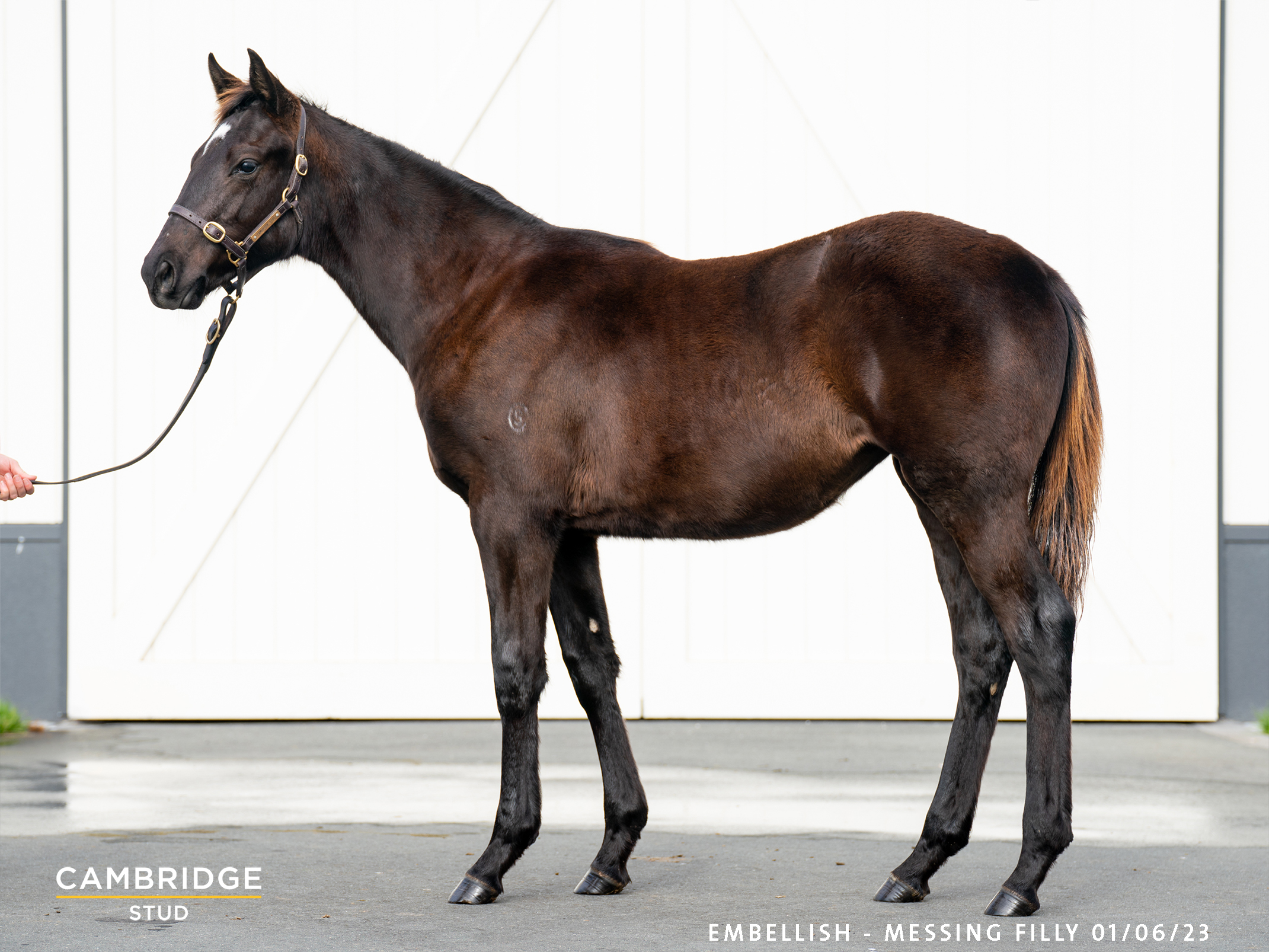 EMBELLISH (NZ) (Brown 2014-Stud 2019). 3 wins 1200m to 1600m, NZ$476,185, A$23,000, New Zealand Two Thousand Guineas, Gr.1, 2d ARC Karaka Million 3YO Classic, RL. Brother to SW Diademe (Te Aroha JC NZ Thoroughbred Breeders' S., Gr.1) and SP Deadly Shadow. Three- quarter-brother to SP Lucetta and SP Relucent. Sire of SP Luberon, Talisker and of What You Wish For, etc. His oldest progeny are 2YOs. 1st dam MESSING, by Dissident. Unraced. This is her second foal. Her first foal is a yearling. 2nd dam ROSSARITA, by Testa Rossa. 3 wins at 1200m, 1300m, 2d BRC Novotel Airport H. Half-sister to Big on Broadway, La Viscomtessa, Wedgetail Eagle (dam of EAGLE WAY, ASSERTIVE EAGLE, IMPRESSIVE EAGLE, SOARESSA). Dam of 3 named foals, 2 to race, 1 winner, inc:- Altair. 6 wins 1100m to 1550m, A$72,880, S$215,538 in Aust. and Singapore, ATC Summer Night Racing H., 2d ATC Everest Carnival H. 3rd dam LA FAVORITA, by Seattle Dancer. Winner at 1600m in France. Sister to SEATTLE RHYME, Seattle Ribbon (dam of SNOQUALMIE BOY, SNOQUALMIE GIRL). Dam of 10 foals, all raced, 8 winners, inc:- Big on Broadway (Fusaichi Pegasus). 5 wins-1 at 2-at 1000m, 1200m, R260,900, 2d Scottsville Debutante S., Gr.2. Producer. La Viscomtessa (Viscount). Winner at 1450m, 3d SAJC HC Nitschke S., L. Wedgetail Eagle. 2 wins at 2 at 1000m, MVRC Dulcie 2YO H. Dam of- EAGLE WAY (More Than Ready). 8 wins-3 in succession-1600m to 2400m, A$517,750, HK$20,930,000, BRC Queensland Derby, Gr.1, HKJC Jockey Club Cup, Gr.2, Queen Mother Memorial Cup, Gr.3, 3d HKJC Queen Elizabeth II Cup, Gr.1-twice, Champions & Chater Cup, Gr.1. ASSERTIVE EAGLE (Danewin). 4 wins-3 in succession-1200m to 1540m, A$271,750, SAJC Proud Miss S., L, 2d VRC AV Kewney S., Gr.2, MRC Sportingbet Series Final, Gr.3, Murray Bridge Gold Cup, L. Producer. SOARESSA (Twining). 4 wins at 1050m, 1200m, A$183,480, SAJC Proud Miss S., L, 2d VRC Straight Six H., L, SAJC WH Wylie H., L. Dam of- THERMAL CURRENT (Exceed and Excel). 8 wins 1000m to 1200m, A$938,975, SAJC DC McKay S., Gr.3, MVRC Red Anchor S., Gr.3, VRC Absolut S., L, MRC WJ Adams H., L, 3d MRC Rubiton S., Gr.2. FOREVER FREE (Exceed and Excel). 5 wins-3 in succession at 2-955m to 1100m, A$354,200, to 2021-22, SAJC Queen Adelaide S., L, MRC Robert Taranto 2YO H., MVRC Ladbrokes 55 Second Challenge H. IMPRESSIVE EAGLE (Rubiton). 4 wins-1 at 2-1100m to 1600m, A$305,675, SAJC Laelia S., L, Dequetteville S., L, 2d MRC Thoroughbred Club S., Gr.3, 3d SAJC Robert Sangster S., Gr.1. Dam of- Thorondor (Fastnet Rock). 4 wins-2 at 2-to 1300m, A$208,600, to 2021-22, 2d VRC Danehill S., Gr.2, 4th MRC HDF McNeil S., Gr.3. War Eternal (Pierro). 2 wins-1 at 2-at 1400m, A$418,750, to 2021-22, 2d Newcastle JC Spring S., Gr.3, 3d MVRC Alister Clark S., Gr.2. Rough Ride. 2 wins at 1200m, 1350m in Aust. Dam of 3 winners- KALASHNIKOV (Capitalist). 2 wins at 2 at 1100m, 1200m, A$199,250, Canberra RC Black Opal S., Gr.3, ATC Hyland Race Colours P. |