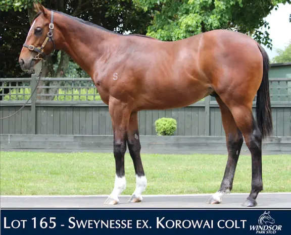 SWEYNESSE (AUS) (Bay or Brown 2011-Stud 2016). 4 wins-1 at 2, ATC Gloaming S., Gr.3. Leading First Season Sire in NZ in 2019-20. Sire of 141 rnrs, 71 wnrs, inc. SW Lucky Sweynesse (HKJC Centenary Sprint Cup, Gr.1), Only Words, Dragon Queen, Special Swey, Bonita Aurelia, Brix, SP Explosively - Solid Impact (H.K.), Signora Nera, Beau Rouge and of Happy United, La Bella Nera, Sweysive, Astrakhan, Con Artist, Fly My Wey, etc. 1st dam KOROWAI, by Belardo. Unraced. Half-sister to FRANCESCA. This is her first foal. 2nd dam MATAGOURI, by High Chaparral. 2 wins at 1200m, 1600m, 2d Waikato RC Munns the Man's Store H., 3d WRC Rydges Wellington H., Counties RC TAB Pukekohe H. Dam of 3 named foals, 2 to race, 1 winner, inc:- FRANCESCA (Iffraaj). 5 wins at 1400m, NZ$98,918, Rotorua S., Gr.3, Waikato RC Peter Kelly-Bayleys Real Estate H., Valachi Downs Foxbridge H., 2d Waikato RC Te Rapa Tavern H., BOP RC Dobson's Refrigeration S. 3rd dam TRIAGE, by Volksraad. Winner at 1400m. Half-sister to MONTEREY BAY, Odessa (dam of AYRTON). Dam of 9 foals, 8 to race, 7 winners, inc:- The Governator. 4 wins at 1200m, 1400m, WRC New World Railway Metro H., Vernon & Vazey Truck Parts H., Otago RC Nellies Sports Bar S., 2d WRC Hutt & City Taxis H., Otago RC Wal's Nurseries H., Mico Plumbing H., 3d CJC The Informant H., Otago RC Sky City Casino Queenstown H., Southland RC Sheet Metalcraft Ltd H. Cheerful Frame. 2 wins at 1400m, 1650m, HKJC Kwu Tung H., Hotel Service H. Niceone. 6 wins-3 in succession-at 1100m, 1200m, 56,362Rgt., S$210,597 in Malaysia and Singapore. Roussanne. Winner at 1200m, 3d CJC NZB Insurance Pearl Series 2YO S., Nobby Bussell Memorial 2YO S. Muriwai. Winner at 1200m, 3d BOP RC O'Connor Warren Insurance H., Rotorua RC NZB Insurance Pearl Series H. Dam of- Sir Sterling. 2 wins at 1200m, 1400m to 2023-24, Waikato TR Fluid Power Distributors H. 4th dam SABBATICAL, by Bakharoff. 4 wins-2 at 2-900m to 1400m, CJC Canterbury Belle S., L, The Loft Art Gallery H., 2d CJC Welcome S., L, 3d Wanganui JC Trudy Thomson Memorial S., L, 4th CJC Canterbury Breeders' S.H., L. Dam of 7 foals, 6 to race, 5 winners- MONTEREY BAY (Kaapstad). 2 wins-1 at 2-at 1200m, 1600m, Manawatu RC Eulogy S., Gr.3, 3d ARC Soliloquy S., L, Waikato RC Glenview New World H., 4th New Zealand Oaks, Gr.1. Producer. Nuance. Winner at 1200m, WRC Tommy Harrigan 3YO Trophy. Dam of- Avancer - Legend of Colour (H.K.) (Kaapstad). 5 wins to 1600m, ARC The Oaks Stud H., 3d Mercedes-Benz Hong Kong Derby Trial, L. Odessa. Unraced. Dam of 3 winners- AYRTON (Iffraaj). 6 wins-3 in succession-1200m to 1600m, A$665,475, BRC Gunsynd Classic, Gr.3, MRC Victoria H., Gr.3, Darren Gauci H., Neds Filter Form H., Ken Sturt H., 2d BRC Fred Best Classic, Gr.3, MRC Testa Rossa S., L, 3d VRC Sofitel H., L. |