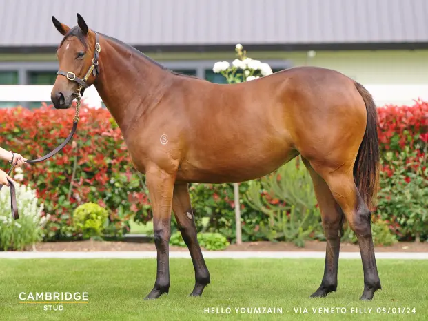 HELLO YOUMZAIN (FR) (Bay 2016-Stud in France 2021, NZ 2021). 5 wins-2 at 2-at 6f, £432,851, €160,878, Royal Ascot Diamond Jubilee S., Gr.1, Haydock Sprint Cup, Gr.1, Sandy Lane S., Gr.2, Criterium de Maisons- Laffitte, Gr.2, 2d Deauville Prix Maurice de Gheest, Gr.1, 3d Royal Ascot Commonwealth Cup, Gr.1. Half-brother to SW Royal Youmzain, SW Zuhoor Baynoona and SP Saglawy. His oldest SH-bred progeny are yearlings. 1st dam VIA VENETO, by Lawman. Winner at 2300m in France. Half-sister to I'M YOUR MAN - HE'S YOUR MAN (Aust.), PERFECT HEDGE (dam of CALLED TO THE BAR), Ragazza Mio, Sacrifice My Soul, Holy Salt (dam of BAPTISM). This is her fourth foal. Her third foal is a 2YO. Dam of two foals to race, inc:- Algendy (g. by Almanzor). Winner at 1400m in 2022-23 in Aust. 2nd dam VIA SALERIA, by Arazi. Winner at 9f in Ireland. Half-sister to POLIGLOTE, ANIMATRICE (dam of SADLER'S FLAG), ALEXIUS, KING ALEX, ADMIRE KAISER, Star Begonia (dam of FIVE DYNASTIES, NAVAJO MOON), Ring Beaune (dam of CELEBRISSIME, SPECIAL RING, SINGING). Dam of 14 foals, 13 to race, 10 winners, inc:- I'M YOUR MAN - HE'S YOUR MAN (Aust.) (Cape Cross). 5 wins 1500m to 2400m, £9,569, €50,800, A$730,100, ATC Epsom H., Gr.1, Kingston Town S., Gr.3, Winter Challenge H., L, Lyon-Parilly Prix Bédel, L, 2d VRC LKS Mackinnon S., Gr.1, 3d ATC Chipping Norton S., Gr.1. PERFECT HEDGE (Unfuwain). 4 wins-1 at 2 and 3 in succession-1800m to 2200m, €154,237, Saint-Cloud Prix Pénélope, Gr.3, Leopardstown Salsabil S., L, 3d Longchamp Prix Saint-Alary, Gr.1. Dam of 6 winners- CALLED TO THE BAR (Henrythenavigator). 8 wins 2000m to 3100m, €440,710, US$220,000, HK$660,000, 45,875Dhs, ParisLongchamp Prix Vicomtesse Vigier, Gr.2, Longchamp Prix Gladiateur, Gr.3-3 times, 2d Chantilly Prix Royal Oak, Gr.1, Belmont Derby, Gr.1. Defrost My Heart (Fastnet Rock). 3 wins 2000m to 2400m, ATC TAB Rewards H., 2d Vichy Prix Madame Jean Couturié, L. Dam of- Saltwell (Australia). 2 wins at 2400m, 2900m in 2023, 3d ParisLongchamp Prix Joubert, L. Stand My Ground (Cape Cross). 5 wins 1350m to 1950m, 2d Saint-Cloud Prix Tantième, L, Prix Altipan, L, 3d Doncaster Mile, L. Ragazza Mio (Generous). 2 wins at 2400m, 2500m, 2d Saint-Cloud Prix Petite Etoile, L, 3d Lyon-Parilly Prix René Bédel, L. Dam of 7 winners- Gosh (Peintre Celebre). 3 wins-1 at 2-1900m to 2500m, 3d Deauville Prix Minerve, Gr.3, Chantilly Prix des Tourelles, L. Sacrifice My Soul (Nayef). 2 wins at 2200m, 2d Saint-Cloud Prix Scaramouche, L, 4th Chantilly Prix du Conseil de Paris, Gr.2. Dam of- Pearling Path (Holy Roman Emperor). Winner at 2 at 6f, 2d Royal Ascot Chesham S., L, 3d Dundalk Star Appeal S., L. Holy Salt. Winner at 1600m, 2d Saint-Cloud Prix Motrico. Dam of 2 winners- BAPTISM (Sea the Stars). 3 wins-1 at 2-2000m to 2400m, Roma Premio Carlo d'Alessio, Gr.3, Premio Botticelli, L. Cross Rate. Unraced. Dam of 5 winners- The Cunning Fox (Reliable Man). 4 wins 1606m to 2238m, A$350,350, to 2023-24, 2d VRC St Leger, L, MRC Galilee Series Final H., L. |