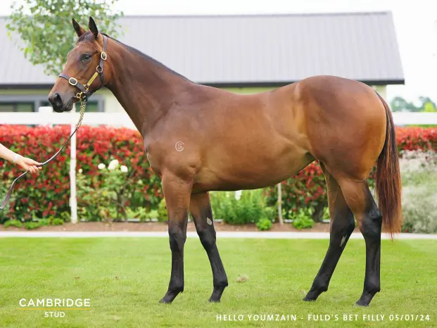 HELLO YOUMZAIN (FR) (Bay 2016-Stud in France 2021, NZ 2021). 5 wins-2 at 2-at 6f, £432,851, €160,878, Royal Ascot Diamond Jubilee S., Gr.1, Haydock Sprint Cup, Gr.1, Sandy Lane S., Gr.2, Criterium de Maisons- Laffitte, Gr.2, 2d Deauville Prix Maurice de Gheest, Gr.1, 3d Royal Ascot Commonwealth Cup, Gr.1. Half-brother to SW Royal Youmzain, SW Zuhoor Baynoona and SP Saglawy. His oldest SH-bred progeny are yearlings. 1st dam FULD'S BET, by I Am Invincible. 4 wins-2 at 2-1000m to 1200m, A$209,600, WATC Gimcrack S., L, Westspeed 2YO P., Ascot's Superheroes & Villains Day H., Lunar Raceday H., 2d WATC Belgravia S., L, Westspeed H., Sponsor a Race H., 3d WATC Placid Ark S., L, Jungle Mist Classic, L, Westspeed H. Half-sister to IRISH BET - HONG KONG BET (H.K.), Rockstar Rebel - Cheerful Giggles (H.K.). This is her fifth foal. Her fourth foal is a 2YO. Dam of two foals to race- Crypto Tycoon (g. by All Too Hard). Winner at 1200m in 2022-23, 3d Ipswich TC Ipswich Cup Tickets P. Fuld's Doubt (f. by Not a Single Doubt). Placed at 3 in 2023-24 in Aust. 2nd dam DUBLIN ME BET, by O'Reilly. Unraced. Dam of 9 foals, 7 to race, all winners, inc:- FULD'S BET (I Am Invincible). 4 wins. See above. IRISH BET - HONG KONG BET (H.K.) (Smart Missile). 3 wins-1 at 2-at 1000m, A$315,750, HK$3,611,410, ATC Inglis Nursery, RL, HKJC Le French May Trophy H., Let Me Fight H., 2d HKJC Caine H. Rockstar Rebel - Cheerful Giggles (H.K.) (Rebel Raider). 2 wins at 1300m, 2200m, A$202,420, HK$324,300, 2d BRC Queensland Derby, Gr.1, 3d VRC TCL S., L, HKJC Yau Oi H. Winfull Patrol. 4 wins at 1000m, 1200m, HK$4,349,875, HKJC Sa Po H., ATV Miss Asia Pageant H., Uranus H., Yuk Sau H., 2d HKJC Hoi Ha H. 3rd dam TREBLE YOUR BET, by Lake Coniston. 2 wins at 1000m, 1200m in Aust. Half-sister to LE DESTINA, EXCHEQUER, Better Succeed (dam of CHEVAL DE TROY). Dam of 4 foals, 3 to race, all winners, inc:- Quadruple. 5 wins 1300m to 1430m in Aust. 4th dam DOUBLE YOUR BET, by Palace Music. 7 wins 1100m to 1500m, A$243,480, STC Theo Marks H., Gr.2, 2d STC Civic H., L, 3d AJC Apollo S., Gr.2, Light Fingers S., Gr.3, STC Missile S., Gr.3, AJC Hall Mark S., L, 4th AJC Flight S., Gr.1, Show County H., L-twice, STC Moet & Chandon H., L. Half-sister to DIAMOND DANE. Dam of 6 foals, 5 to race, all winners, inc:- LE DESTINA (Waajib). 9 wins-3 at 2 and 3 in succession-1400m to 2500m, A$372,485, SAJC Carlton Draught S., Gr.3, VRC RSL H., AJC Strathfield Car Radios 2YO H., 2d Gosford Guineas, L, 4th QTC Brisbane Cup, Gr.1. EXCHEQUER (Marauding). 7 wins-3 in succession-1000m to 2000m, A$181,030, WATC Strickland S., Gr.3, 2d WATC York S., L. Better Succeed. 3 wins at 1200m, STC Canterbury League Club H. Dam of- CHEVAL DE TROY (Zabeel). 4 wins-1 at 2-1200m to 2100m, ARC New Zealand Derby Trial S., L, 3d STC Canterbury Guineas, Gr.1, Wellington Guineas, Gr.2, 4th New Zealand Derby, Gr.1. Sire. |