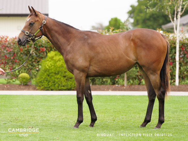 BIVOUAC (AUS) (Bay 2016-Stud 2021). Co-champion 3YO Male Sprinter in Australia in 2019-20. Joint Head of the 2020 WTR (Sprint). 7 wins-2 at 2-1100m to 1400m, A$5,696,110, VRC Newmarket H., Gr.1, Sprint Classic, Gr.1, ATC Golden Rose S., Gr.1, Run to the Rose H., Gr.2, Kindergarten S., Gr.3, MRC Vain S., Gr.3, 2d VRC Coolmore Stud S., Gr.1. Brother to SW Coruscate (MRC Testa Rossa S., L). His oldest progeny are 2YOs. 1st dam INFLICTION, by Big Brown. Unraced. Half-sister to EAWASE, Bezique, Sensical. This is her fifth foal. Her fourth foal is a 2YO. Her third foal is an unraced 3YO. Dam of two foals to race, inc:- Karuta King (g by Sebring). Winner at 2 at 1200m in Aust. 2nd dam KARUTA QUEEN, by Not a Single Doubt. 6 wins-4 in succession at 2-1000m to 1200m, A$1,857,675, MVRC Red Anchor S., Gr.3, GCTC Magic Millions 2YO Classic, RL, ATC Heritage S., L, Wyong RC Magic Millions 2YO Classic, 2d MVRC William Reid S., Gr.1, MRC Schillaci S., Gr.2, Canberra RC Black Opal S., L, GCTC Silk Stocking H., L, 3d ATC San Domenico S., Gr.3, VRC Bob Hoysted H., L, 4th ATC Run to the Rose H., Gr.3, MRC Rubiton S., Gr.3. Dam of 8 named foals, 6 to race, 4 winners, inc:- EAWASE (Sebring). 2 wins at 2 at 1200m, A$148,706, BRC Bill Carter S., L, ATC Unconquered 2YO P., 2d MRC Twilight Glow S., L. Bezique (Spirit of Boom). 4 wins-1 at 2 and 3 in succession-1000m to 1200m, A$254,950, to 2023-24, BRC Road to Magic Millions on Sale Now P., Season Greetings P., Roku Gin H., 2d BRC Bright Shadow H., L, Helen Coughlan S., L, Bill Carter S., L, Ipswich TC Gai Waterhouse Classic, L. Sensical (Zoustar). Placed at 2 & 3, A$80,870, to 2023-24, 3d MRC Blue Diamond Preview (f), Gr.3, 4th MRC Blue Diamond Prelude (f), Gr.2. Oh Please Dianna. 3 wins at 1000m, 1100m, A$114,615, ATC Ranvet H. 3rd dam CARD QUEEN, by Final Card. 5 wins-2 at 2-1000m to 1200m, A$302,550, VATC Blue Diamond Prelude (f), Gr.3, VRC Sunsmart Sun Protect 2YO H., Stegbar H., BTC Might & Power H., Jackaroo H., 3d AJC Wiggle H., L, VRC Shamrock Travel H., L, MRC Geoffrey Bellmaine S., L, GCTC Silk Stocking H., L, th BTC Glenlogan Park S., L. Half-sister to Our Teneriffe (dam of VAIN QUEEN). Dam of 12 foals, 9 to race, 8 winners, inc:- KARUTA QUEEN (Not a Single Doubt). 6 wins. See above. Amelia's Love. 2 wins at 1008m, WATC Young Membership H. Producer. Black Queen. 2 wins at 1000m, 1200m, 4th WATC Gimcrack S., L. Dam of- Keep Attacking. 5 wins 1000m to 1200m, A$198,776, to 2024-25, WATC Tabtouch H., Drummond Golf H., Iron Jack H. Amusements. Unraced. Dam of 5 winners- Cunnamulla Fella. 4 wins 1200m to 1600m, A$179,050, to 2024-25, BRC U&U Recruitment H., Ladbrokes H., SCTC Maeva Hospitality H. 4th dam EYE THAT LADY, by Vite Cheval. 4 wins 1000m to 1200m in Aust. Three-quarter-sister to CHEVAL CAVALIER, DON'T CRY (dam of TEARS ROYAL). Dam of 6 foals, 5 to race, all winners, inc:- |