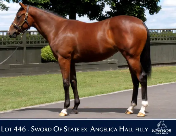 SWORD OF STATE (AUS) (Bay or Brown 2018-Stud 2022). Champion 2YO in NZ in 2020-21. 6 wins-4 at 2-at 1100m, 1200m, NZ$295,150, A$37,850, ARC Diamond S., Gr.1, Auckland TR Almanzor Trophy, Gr.3, King's P., Gr.3, Matamata RC Slipper S., Gr.3, 2d GCTC Gold Coast Guineas, Gr.3, 3d ARC Eclipse S., Gr.2. Out of SP In the Vanguard. Grandson of SW Sharp (AJC Light Fingers S., Gr.2). His oldest progeny are yearlings. 1st dam Angelica Hall, by Guillotine. 2 wins at 1200m, ARC Coca-Cola H., 2d ARC Mr Tiz Trophy, Gr.3, Manawatu RC Flying H., L, Hong Kong Jockey Club Trophy, 4th WRC Lightning H., L. Three-quarter-sister to Val de Loire (dam of FOX HALL). This is her seventh foal. Her sixth foal is an unraced 3YO. Dam of four foals to race, all winners- ANGELIC MISS (f by Savabeel). 7 wins 1100m to 1400m, A$375,100, WATC Jungle Mist Classic, L, Jungle Dawn Classic, L, Scenic Blast S., L, Crown Perth H.-twice, Tabtouch Masters H., 2d WATC Solo Zero H., Crown Perth H., 3d WATC Marjorie Charleson Classic, Heineken 3 H.-twice, Amelia Park H., 4th WATC Cyril Flower S., L. Supreme Khan (g by Mongolian Khan). 5 wins 1200m to 1600m, NZ$90,221, Cambridge JC Equine Hospital H., 2d CJC Haase Marshall Drainage S., Waikato RC Join Team Te Akau H., Vodafone Warriors H., Marton JC Spreading Rural Bulk H., 3d Matamata RC Ancroft Developments H. White Bear (g by Shamexpress). 2 wins at 1206m to 2023-24, 2d MRC Barastoc H., 3d MRC Sharp EIT Solutions H. Kung Fu Fighting (g by Turn Me Loose). 2 wins at 1400m, 1600m, 3d Murray Bridge RC Dutton's Easy To Do Business With H. 2nd dam GRETA HALL, by Kaapstad. 5 wins 1000m to 1400m, A$114,146, NSW Tatt's RC Carrington S., L, STC Triscay S., L, Otago Breeders' S., L. Sister to GOLDEN SWORD, three-quarter-sister to MULAN PRINCESS (dam of ROYAL DESCENT), half-sister to MADAM VALETA (dam of FALKIRK, LUSCILLA), BALMORAL KEEP. Dam of 8 foals, 7 to race, 5 winners, inc:- Angelica Hall (Guillotine). 2 wins. See above. Val de Loire. Winner at 1350m in Aust. Dam of 5 winners- FOX HALL (Foxwedge). 6 wins at 1200m, 1400m, A$309,375, SAJC HC Nitschke S., L, 3d VRC TCL TV S., Gr.3, 4th SAJC Spring S., Gr.3. 3rd dam Lovenvain, by Vain. 3 wins at 1100m, 1200m, BOP RC 18th Avenue Motel H., 3d CJC Edward Lumley H., L. Dam of 9 named foals, 8 to race, 7 winners, inc:- GOLDEN SWORD (Kaapstad). 8 wins to 1600m, A$739,375, AJC Epsom H., Gr.1, VATC Toorak H., Gr.1, VRC Bobbie Lewis H., Gr.3, AJC Carbine Club S., L, 2d STC George Ryder S., Gr.1, 3d MVRC WS Cox P., Gr.1. MADAM VALETA (Palace Music). 9 wins 1010m to 1400m, NZ$60,150, A$80,000, Rotorua RC Lion Brown 1200 S., Gr.3. Dam of 11 winners- FALKIRK (Tale of the Cat). 8 wins 1100m to 1300m, £8,060, NZ$55,465, A$593,200, QTC Cup, Gr.2, STC Theo Marks H., Gr.2. Sire. MULAN PRINCESS (Kaapstad). 6 wins 1200m to 1900m, NZ$850, A$326,770, STC Hill S., Gr.2, AJC PJ Bell H., L. Dam of 6 winners- ROYAL DESCENT (Redoute's Choice). 5 wins 1200m to 2400m, A$2,709,780, Australian Oaks, Gr.1, ATC Warwick S., Gr.2. |
