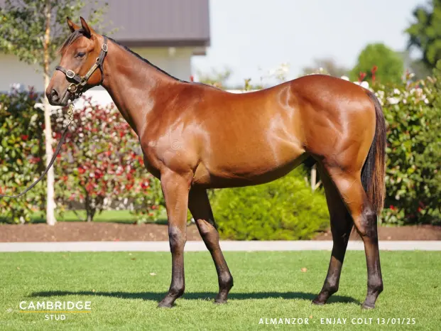 ALMANZOR (FR) (Bay or Brown 2013-Stud 2018). 8 wins-3 at 2, Chantilly Prix du Jockey Club, Gr.1. Leading Sire of 2YOs in NZ in 2021-22. Sire of 455 rnrs, 242 wnrs, 21 SW. His SH-bred progeny inc SW Manzoice (VRC Victoria Derby, Gr.1), Positivity, Sudbina, Zabmanzor, Moonlight Magic, Cheval d'Or, (Lord) Dynastic, Rise at Dawn, Nucleozor, Keeneland, etc. His NH-bred progeny inc SW Circle of Fire, Castle Way, Athabascan, etc. 1st dam ENJAY, by High Chaparral. 2 wins at 1600m, 2100m, Waikato RC Echoes of Heaven at Linwood Park Stud H., 3d ARC Lindsay Racing H. Half-sister to ROLLING PIN. This is her seventh foal. Her sixth foal is a 2YO. Dam of four foals to race, three winners, inc:- Familia (f by Makfi). 4 wins-1 at 2-1000m to 1400m, NZ$123,850, Avondale JC Western Lock Services H., ARC Delta Insurance H., Counties RC Lone Star Pukekohe H., 2d Matamata RC Lisa Chittick P., Whangarei RC Harcourts Tai Tokerau Trophy H., Matamata RC Comag H., 3d ARC Westbury Classic, Gr.2, Bonecrusher S., Gr.3, Auckland TR Hallmark Stud H., L, White Cliffs Timber H., 4th ARC Hallmark Stud H., L. Key Largo (g by Ocean Park). Winner at 1600m in 2023-24. Flag Hunter - Top Mountain Hero (Mac.) (g by Sacred Falls). Winner at 1500m in Macau. 2nd dam GYPSY'S DAUGHTER, by Mi Preferido. 7 wins 1600m to 2200m, NZ$57,600, A$123,555, STC Neville Sellwood S., L, Lord Mayor's Cup, L, Manawatu Breeders' S., L, BTC Conrad International Hotel H., Avondale JC Foley H., Waikato RC Pencarrow Stud H., 4th Waikato RC Windsor Park Sprint H., L. Half-sister to KISS N' A SHILLING. Dam of 7 foals, 6 to race, 5 winners, inc:- ROLLING PIN (Pins). 8 wins 1200m to 1600m, A$487,450, ATC Shannon S., Gr.2, Newcastle JC Cameron H., Gr.3, ATC Canterbury BMW H., James Boag H., Foundation Membership H., 2d ATC Blackwoods MacNaught H., 3d ATC Epsom H., Gr.1, Missile S., Gr.3, 4th ATC All Aged S., Gr.1. 3rd dam JEAN GORDON, by Amalgam. 3 wins 1575m to 2000m, 2d ARC Nutri-Metrics H. Half-sister to JOAL. Dam of 4 named foals, 2 to race, both winners, inc:- GYPSY'S DAUGHTER (Mi Preferido). 7 wins. See above. KISS N' A SHILLING (Crested Wave). 7 wins at 1600m, 2000m, Wairarapa Thoroughbred Breeders' S., L, Manawatu RC Crombie Lockwood H., 4th Cambridge JC Travis S., Gr.2. Grandam of- Pepperano (Court Command). 5 wins-2 at 2 and 3 in succession-1000m to 1400m, A$685,700, BRC Capture the Feeling 2YO H., VRC Off the Track Subzero H., BRC Bartons P., 2d GCTC Magic Millions 2YO Classic, RL, 3d BRC Champagne Classic, Gr.2, Nudgee S., L. 4th dam MAID OF ORLEANS, by Sovereign Edition. Placed at 2 & 3. Dam of 7 foals, 6 to race, 5 winners, inc:- JOAL (Alvaro). 11 wins 1575m to 2200m, NZ$171,660, A$31,690, Counties RC Auckland Thoroughbred Breeders' S., Gr.3. Grandam of- SPACE AGE (Sky Chase). 9 wins-3 in succession-1350m to 2100m, A$492,465, Gosford Gold Cup, Gr.3, AJC Services' Memorial Cup, L. |