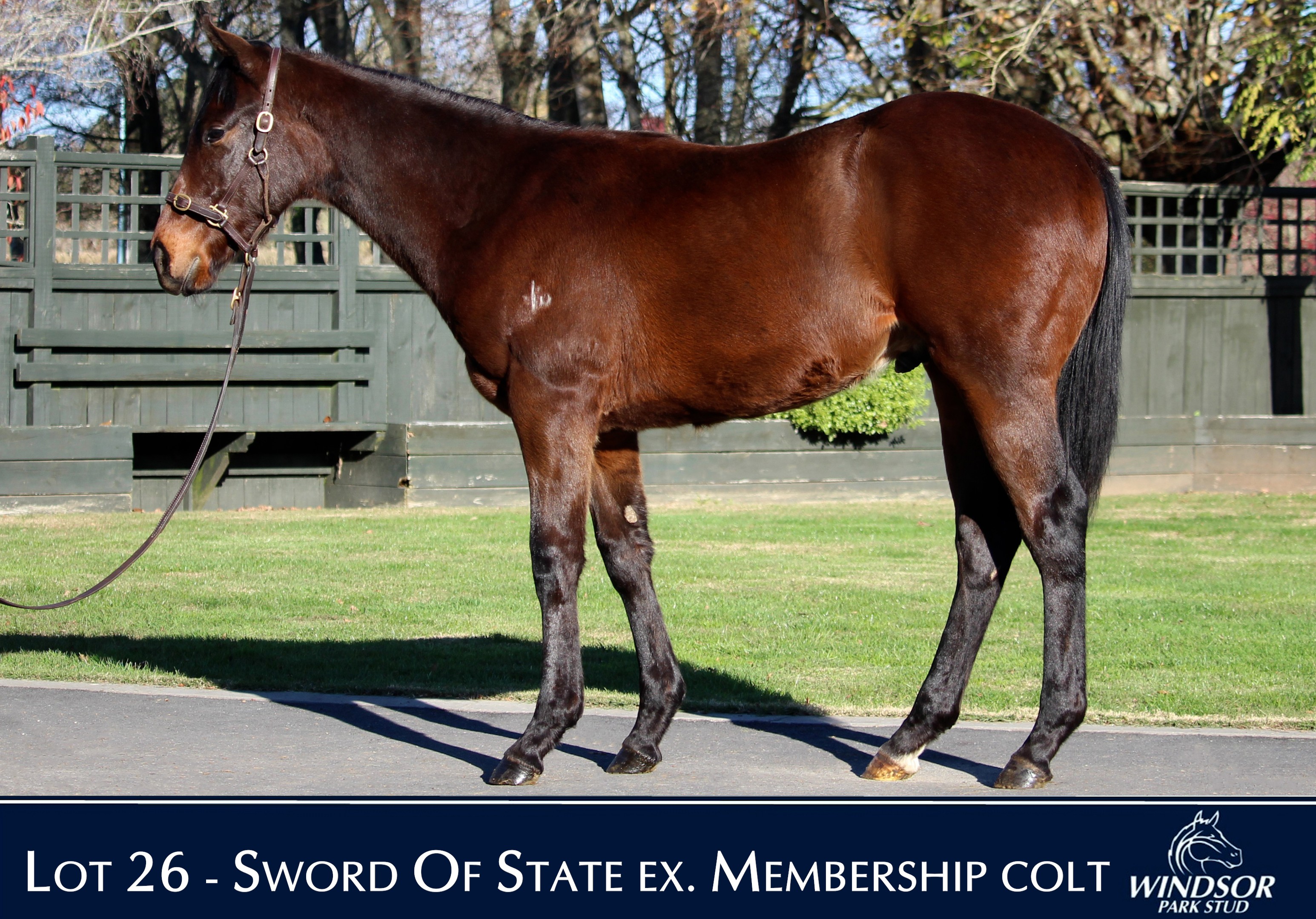 SWORD OF STATE (AUS) (Bay or Brown 2018-Stud 2022). Champion 2YO in NZ in 2020-21. 6 wins-4 at 2-at 1100m, 1200m, NZ$295,150, A$37,850, ARC Diamond S., Gr.1, Auckland TR Almanzor Trophy, Gr.3, King's P., Gr.3, Matamata RC Slipper S., Gr.3, 2d GCTC Gold Coast Guineas, Gr.3, 3d ARC Eclipse S., Gr.2. Out of SP In the Vanguard. Grandson of SW Sharp (AJC Light Fingers S., Gr.2). His oldest progeny are yearlings. 1st dam MEMBERSHIP, by All American. Placed at 2 & 3, 3d ATC Schweppes 2YO P., GCTC NHP H. Three-quarter-sister to Rampage. This is her fourth foal. Her third foal is a 2YO. Dam of two foals to race, inc:- Kindling Spark (f by Manhattan Rain). 3 wins at 1600m, 1800m to 2024-25, CJC Racecourse Hotel H. 2nd dam LODORE FALLS, by Redoute's Choice. 4 wins-1 at 2-1100m to 1203m, A$82,063, MVRC Members Equity Bank P., 4th MVRC St Albans S., L. Sister to Illusional (dam of CHASE THE RAINBOW, MS FUNOVITS), half-sister to SONIC QUEST. Dam of 9 foals, 7 to race, 5 winners, inc:- Cacofonix. 4 wins 1200m to 1400m, NZ$27,870, A$86,720, to 2024-25, BRC Peachester Lodge P., Matamata RC New World S. The States - Lucky Dollar (H.K.). 3 wins at 1000m, 1200m in Aust. and HK, HKJC Li Cup, 2d HKJC Zenith Excellent H., Royal Oak Concept H. Groomed for Glory. 2 wins at 1200m, SCTC Wimmers Premium Soft Drink H. 3rd dam LODORE MAGIC, by Kingdom Bay. Joint Head of The 1995-96 2YO Free H. 4 wins at 2 1000m to 1200m, NZ$163,475, A$18,000, Matamata Breeders' S., Gr.2, WRC Magic Millions Classic S., RL, Manawatu RC Sandhaven Stables 2YO H., 2d STC Reisling Slipper Trial S., Gr.2. Sister to MORGAN BAY, half-sister to Morgan Glory (dam of BELMONT CAT). Dam of 8 named foals, all raced, 5 winners, inc:- SONIC QUEST (Quest for Fame). 6 wins-3 in succession-1200m to 1700m, A$367,250, MVRC Crystal Mile H., Gr.2, MRC Barton S., L, VRC Shaftesbury Avenue H., MRC Jayco H., Rollo Roylance H., 2d MRC Perri Cutten Classic, 3d MRC Heroic H., 4th MVRC Australia S., Gr.1. Illusional. Winner at 1200m, 2d AJC Dual Quest 2YO P. Dam of 7 winners- CHASE THE RAINBOW (Dash for Cash). 5 wins 1200m to 1600m, A$439,638, MVRC Bill Stutt S., Gr.2, MRC TS Carlyon Cup, Gr.3, National Jockeys' Celebration Day H., 2d VRC Henry Bucks S., L, 3d MRC John Dillon S., L, 4th VRC Chester Manifold S., L. MS FUNOVITS (Reset). 2 wins at 2 at 1000m, 1200m, A$389,750, WATC Karrakatta P., Gr.2, VRC Better Beyond 2YO P. Illusionary. 2 wins-1 at 2-at 1200m, MRC Shizu 2YO H. Dam of 7 winners- Under My Spell (Pierro). 5 wins 1400m to 1600m, A$294,250, Pakenham RC Momentum Gaming H., 2d MRC Mannerism S., Gr.3. Invisible. 4 wins-1 at 2-at 1200m, 1400m, ATC TAB Ipad App 2YO P., HKJC Magpie H., Kam Tin H., Paterson H. Sleight of Hand. Placed at 2 in Aust. Dam of 7 winners- Rampage (All American). 2 wins-1 at 2-at 1000m, 1170m, A$145,385, MVRC John Paraskevas 2YO P., 3d ATC Inglis Nursery, RL. |