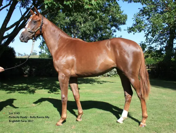 PERFECTLY READY (AUS) (Brown 2002-Stud 2007). 4 wins-2 at 2, SAJC Goodwood H., Gr.1. Leading NZ First Season Sire 2010-11. Sire of 298 rnrs, 141 wnrs, inc. SW Miss Three Stars (CJC Winter Cup, Gr.3), Perfect Start, Moozoon, Al Strada - Twin Delight (H.K.), Lord Turbo - Little Dragon (H.K.), SP Flying Orca, Beejay Belle, Queen Boudicca, Rachel Rafter, Brackenwood, Isle be Ready, Matimba, Motorboat Mike, etc. 1st dam BELLA RUSSIA, by Ustinov. 2 wins at 2100m, 2400m, WRC Keep the Peace H. This is her second foal. Dam of one foal to race. 2nd dam TINTINNABULATION, by Sir Tristram. Unplaced. Half-sister to BELLE DU JOUR, Slav Defence, Elle Duccio (dam of PERFECTLY READY, DUCCIO - TURQUOISE POWER(Mac.)). Dam of 10 named foals, 9 to race, 7 winners, inc:- Speed at Will. Winner at 1650m, HKJC San Po Kong H. Monte Drift. 7 wins to 1400m, 2d AJC Paddock H., 3d AJC Mounties H. Ring a Ding Ding. Winner at 1400m, 2d AJC Cabramatta Inn H. Chief Thunderwing. 4 wins from 2000m to 3200m in Aust. 3rd dam DELIGHTFUL BELLE, by Balmerino. 10 wins-2 at 2-from 900m to 1600m, NZ$3,770, A$132,930, VATC CF Orr S., Gr.2, Memsie S., Gr.2, Thoroughbred Club S., Gr.3, Tranquil Star S., Gr.3, MVRC Carlton Draught S., L, Catalan H., VRC Evening Peal H., 2d VATC Sandown Guineas, Gr.2, 4th VATC Elders Mile H., Gr.1. Dam of 14 foals, 13 to race, 10 winners, inc:- BELLE DU JOUR(Dehere). Champion 2YO Filly in Australia in 1999-2000. Champion Older Female Sprinter in Ireland in 2003. 9 wins-4 at 2-to 1300m, STC Golden Slipper S., Gr.1, VRC Newmarket H., Gr.1, Emirates Classic S., Gr.2, STC Reisling Slipper Trial S., Gr.2, AJC Kindergarten S., Gr.3, VRC Gilgai S., Gr.3, 2d AJC Expressway S., Gr.2, Cork Ballyogan S., Gr.3, GCTC Magic Millions 2YO Classic S., RL, 3d STC Coolmore Classic, Gr.1, AJC Light Fingers S., Gr.2, VRC Emirates Classic S., Gr.2, STC Queen of the Turf S., Gr.2, Theo Marks H., Gr.2, MRC Kevin Heffernan S., L, 4th Nad al Sheba Dubai Golden Shaheen S., Gr.1. Slav Defence(Danehill). 3 wins to 1300m, Selangor TC Class 1 H., STC Eugene H., Kogarah H., 2d Newcastle JC Spring S., L. Belzero. 3 wins to 1500m, BTC Hahn Premium H. Dam of- Below Zero - Above All(H.K.) (Dehere). 3 wins-1 at 2-at 1300m, 1600m, HKJC Dr G H., Ho Pui H., 3d VRC Sires' Produce S., Gr.2. Ma Belle Cherie. 3 wins to 1350m, SAJC Evesham Gold Trophy H. Dam of- Rokuichi Smile(Kurofune). 2 wins-1 at 2-at 1000m, 1200m, 3d Monbetsu Edelweiss Sho, L, 4th Sonoda Hyogo Junior Grand Prix, L. Elle Duccio. Winner at 1000m in Aust. Dam of- PERFECTLY READY(More Than Ready). 4 wins-2 at 2-to 1400m, A$685,650, SAJC Goodwood H., Gr.1, MRC Moonga S., Gr.3, Blue Diamond Prelude (c&g), Gr.3, 2d MVRC Manikato S., Gr.1, VRC Bobbie Lewis H., Gr.3, Poseidon S., L, 3d MRC Blue Diamond S., Gr.1, 4th VRC Emirates S., Gr.1, MVRC Mitchell McKenzie S., L. Sire. DUCCIO - TURQUOISE POWER(Mac.) (More Than Ready). 3 wins from 1500m to 1800m to 2015-16, Macau Derby, L, 2d ATC Dulcify H., L. |