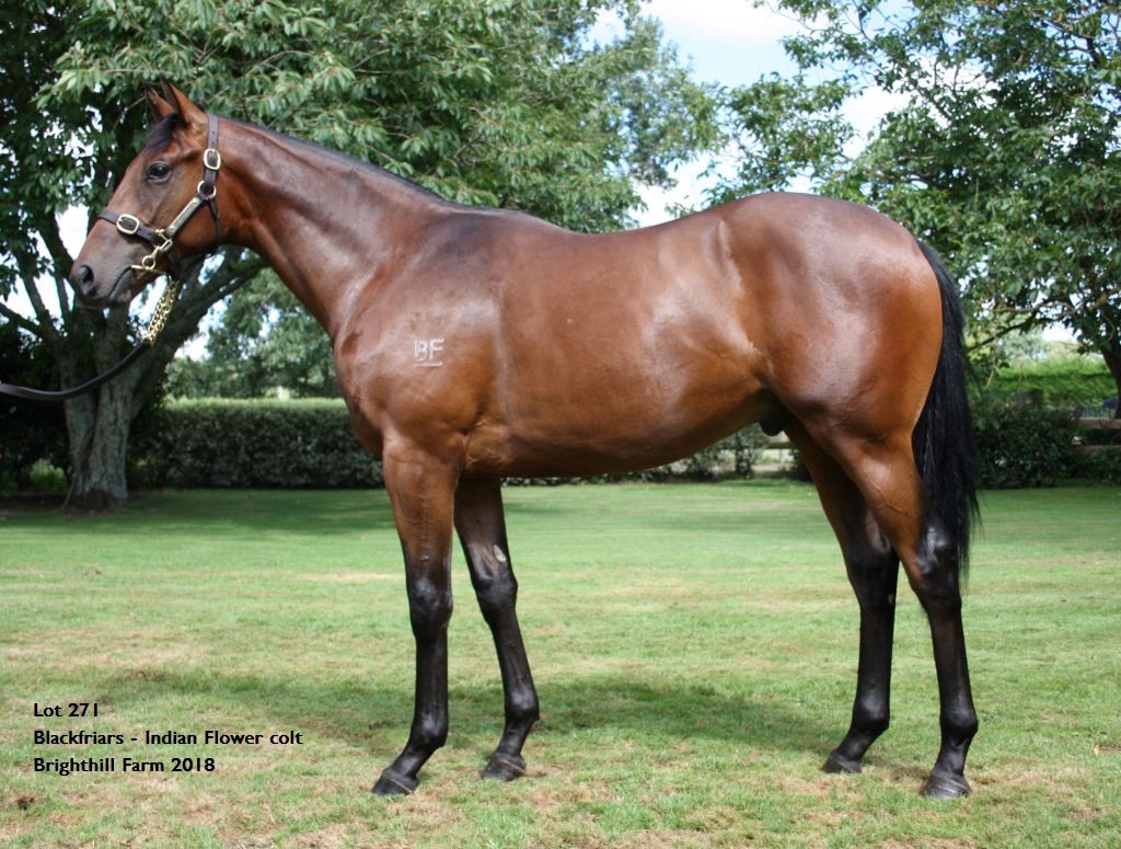 BLACKFRIARS (AUS) (Bay 1996-Stud 2001). 4 wins to 2500m, Victoria Derby, Gr.1. Sire of 657 rnrs, 395 wnrs, 36 SW, inc. SW Black Heart Bart (SAJC Goodwood S., Gr.1), Playing God, God Has Spoken, Rohan, Black Tycoon, Pop Culture, Eclair Surprise, Shining Knight, Kerrific, Mansion House, Prentice, Manjar - Tom's Six (H.K.), Summah's Touch, Chocolate Holic, London Line - Most Beautiful (H.K.), Young Lionel, Moneghetti, etc. 1st dam INDIAN FLOWER, by Husson. Unplaced. Half-sister to ARTISTRY. This is her third foal. Her second foal is a 2YO. Her first foal is an unraced 3YO. 2nd dam LADY PEONY, by Belong to Me. Unraced. Half-sister to Holidazzle. Dam of 5 named foals, 4 to race, 2 winners, inc:- ARTISTRY(Shamardal). 8 wins from 1100m to 1600m, A$562,810, to 2016-17, ATC Maurice McCarten H., Gr.3, VRC Hong Kong Jockey Club S., Gr.3, ATC Newcastle Newmarket H., Gr.3, Hyland Race Colours H., TAB Rewards H., First Excelebration Yearlings H., Blacktown Workers Club Group H., 2d BRC Dane Ripper S., Gr.2, City Tatt's RC Nivison S., Gr.3, 3d ATC Sapphire S., Gr.2, 4th ATC Wenona Girl H., Gr.3. Countryman. 5 wins to 1400m, A$242,585, ATC Big Sports Breakfast H., Testa Rossa at Vinery P., Jockey Celebration Day H., Become a Sponsor P. 3rd dam ZEBIZAN, by Zabeel. Winner at 1400m in Aust. Sister to CRONUS, PRAVDA(dam of PRAVANA), Milliyet (dam of SAMANTHA MISS). Dam of 11 foals, 7 to race, 6 winners, inc:- Holidazzle(Flying Spur). 3 wins-1 at 2-from 1200m to 2100m, NZ$5,925, A$94,650, MRC John Payne H., Hawkes Bay Lion Foundation Juvenile S., 2d BTC Premier's Cup, Gr.3, VRC Bagot H., L, 3d Illawarra 2YO Classic, L, 4th BTC Chairman's H., Gr.3. Producer. Shining Dragon. 6 wins-1 at 2-from 1200m to 1650m, HK$4,533,900, HKJC Racing Post Online H., Tarim He H., Matheson H., Today in Court H. Supreme Gains. 5 wins at 1400m, 1600m, HK$3,544,400, HKJC IndustrialistH. Diario. 2 wins at 1100m, 1200m, MRC Charge Forward H. 4th dam FOREIGN COPY, by Bold Venture. Unraced. Three-quarter-sister to Sovereign Command (dam of ENVOY), Gold Ingot (dam of GOLDEN ERA), half-sister to Gold Street (dam of GOLD STREAK), Van Fleet (dam of CAMPANIA). Dam of 12 named foals, 9 to race, 8 winners, inc:- CRONUS(Zabeel). 11 wins from 1600m to 3200m, NZ$174,425, A$793,460,HK$140,000, SAJC Adelaide Cup, Gr.1, Hawke's Bay Cup, Gr.2,Manawatu RC Awapuni Gold Cup, Gr.2, GCTC Prime Minister's Cup, Gr.2. PRAVDA(Zabeel). 8 wins from 1400m to 2400m, NZ$124,850, A$453,385, Taranaki Cup, Gr.2, 2d New Zealand Oaks, Gr.1. Dam of- PRAVANA(Anabaa). 5 wins from 1200m to 1600m, AJC Aspiration H., L, 2d STC Millie Fox S., Gr.3, 4th STC Coolmore Classic, Gr.1. Milliyet. Unraced. Dam of- SAMANTHA MISS(Redoute's Choice). Champion 3YO Filly in Australia in 2009. 7 wins-2 at 2-from 1150m to 2500m, A$1,763,260, VRC Oaks, Gr.1, AJC Flight S., Gr.1, Champagne S., Gr.1, Furious S., Gr.2. |