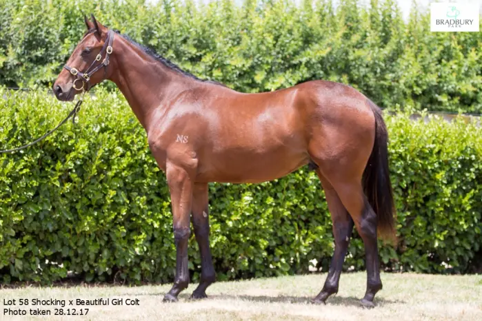 SHOCKING (AUS) (Bay 2005-Stud 2011). 7 wins from 1300m to 3200m, VRC Australian Cup, Gr.1. Sire of 141 rnrs, 67 wnrs, inc. SW Fanatic (New Zealand Oaks, Gr.1), Chocante, The Hassler - Circuit Hassler (H.K.), Shocking Luck - Zilong (H.K.), Pure Pride, SP Camino Rocoso, Hello M'Lady, Antonio Giuseppe, Megawatt, Electric Aura, High Class and of Shockaholic, Repo Sun, Tingle Marc, Barnaby, Battlecamp, etc. 1st dam BEAUTIFUL GIRL, by Black Minnaloushe. 7 wins at 1200m, NZ$165,437, ARC Darley P., Gr.3, Suburban Newspapers Community Trust H., NZ Herald Xmas Carnival H., Telecom H., Avondale JC La-Z-Boy Chair 3YO H., All'sWell Farewell H., Counties RC Highview H., 3d Avondale JC Concorde H., Gr.2. This is her third foal. Her second foal is a 2YO. Her first foal is unraced. 2nd dam PICCADILLY LILY, by Rubiton. Unraced. Half-sister to (THE) GRANDMASTER, Gypsy Moth(dam of GYPSY FAIR). Dam of 12 named foals, 10 to race, 6 winners, inc:- BEAUTIFUL GIRL(Black Minnaloushe). 7 wins. See above. Miss Danni. 4 wins from 1200m to 1600m, Wanganui JC Coro Angel S. Dusky Beau. 2 wins at 2150m, 2400m, AJC Futures H., North Sydney H. 3rd dam ROUND THE WORLD, by Sea Anchor. 5 wins from 1600m to 2600m, A$411,080, Queensland Oaks, Gr.1, AJC Chairman's H., Gr.3, STC Neville Sellwood S., L, 2d AJC Oaks, Gr.1, AJC Sydney Cup, Gr.1, QTC Brisbane Cup, Gr.1, STC Storm Queen S., Gr.2, 3d QTC Brisbane Cup, Gr.1, 4th AJC Queen Elizabeth S., Gr.1. Three-quarter-sister to ROYAL REGATTA(dam of MUSHTAK), half-sister to Tour de France, Positive Thoughts (dam of SOUNDS POSITIVE). Dam of 6 foals, 3 to race, all winners, inc:- (THE) GRANDMASTER(Centro). 3 wins from 1900m to 2400m, A$141,640, 14,400Rgt. in Aust. and Malaysia, City Tattersall's Club Cup, L, STC Bexley H., 2d VRC Lean Cuisine H., Gr.2, AJC TL Baillieu H., L. Gypsy Moth(Zabeel). 4 wins from 1600m to 2150m, ARC Haunui Farm H., Schofields H., 2d ARC Lindauer Grandeur S., Gr.3. Dam of- GYPSY FAIR(Falkirk). 7 wins from 1200m to 1600m, NZ$153,055, to 2016-17, Marton JC Metric Mile, Gr.3, WRC IRT North Island Challenge H., Levin RC Linwood Park Stud H., 4th Rotorua S., Gr.3. 4th dam LA MASCARADE, by Pretendre. Unplaced. Half-sister to ROYAL REGATTA(dam of MUSHTAK), LOVE IN A MIST, BAYSHORE, Lord La Di Da. Dam of 9 foals, 6 to race, 5 winners, inc:- ROUND THE WORLD(Sea Anchor). 5 wins. See above. Tour de France(Balmerino). 2 wins at 1600m, 1900m, AJC Flick Pest Control H., STC Taubmans Paints H., 2d STC Christmas Cup, L. Producer. Effie and Alice. 3 wins at 1400m, 1600m, WRC Lindauer H. Grandam of- LEIGH VALLEY(Bianconi). 5 wins from 1100m to 1600m, NZ$104,875, WRC Cuddle S.H., Gr.3, 4th WRC Captain Cook S., Gr.1. Dam of- VALLEY GIRL(Mastercraftsman). 4 wins from 1200m to 2000m,NZ$273,375, A$110,000, to 2016-17, Waikato RC Herbie Dyke S., Gr.1. |