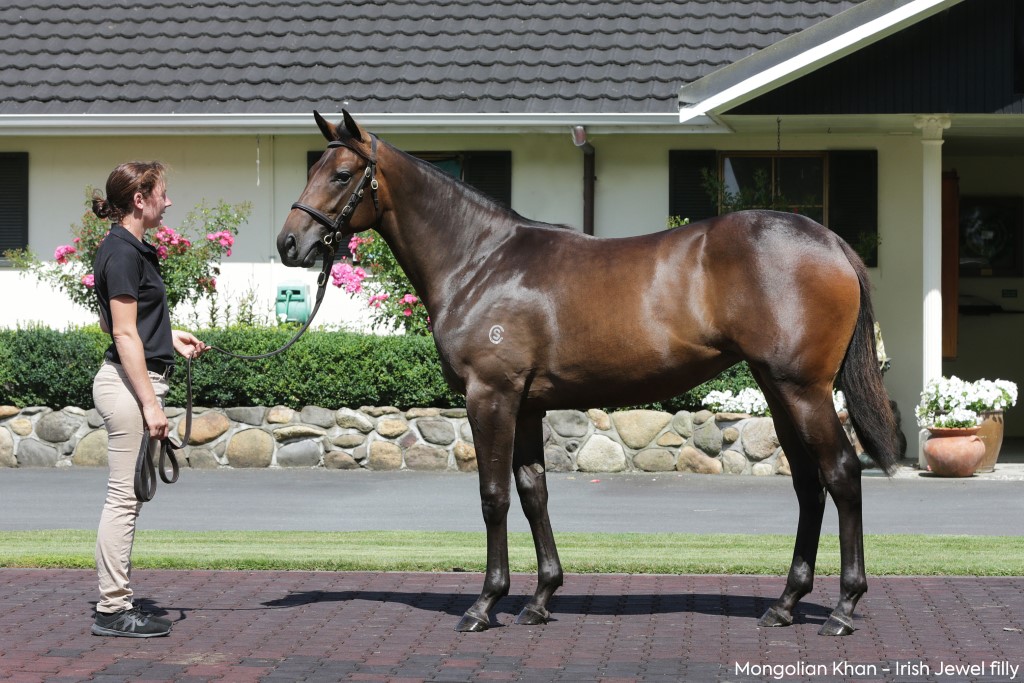 MONGOLIAN KHAN (AUS) (Bay 2011-Stud 2016). Horse of the Year & Champion Stayer in NZ in 2014-15 & 2015-16. Champion 3YO in NZ in 2014-15. 8 wins from 1400m to 2400m, NZ$625,500, A$3,363,250, New Zealand Derby, Gr.1, Australian Derby, Gr.1, MRC Caulfield Cup, Gr.1, Avondale Guineas, Gr.2, Waikato Guineas, Gr.2. Half-brother to SW Young Centaur (Wellington Cup, Gr.1). His oldest progeny are yearlings. 1st dam IRISH JEWEL, by Street Cry. 2 wins-1 at 2-at 1100m, 1600m, Avondale JC La-Z-Boy Chair 2YO H., 2d CJC PGG Wrightson Seeds H., BOP RC New World Mount Maunganui H. Half-sister to Thunderbird One . This is her fifth foal. Her fourth foal is a 2YO. Dam of one foal to race. 2nd dam LOWAN BEHOLD, by Umatilla. Winner at 1700m in Aust. Half-sister to Lowendale Road . Dam of 6 named foals, 3 to race, 2 winners, inc:- Thunderbird One (Storm Creek). 6 wins 1200m to 1600m, Hawkes Bay Westbury Stud H., Waikato RC Mccarrollracing.co.nz H., ZM 89.8 H.,Matamata RC Veterinary Services H., 3d ARC Sofitel Luxury Hotels S., Gr.3 . 3rd dam LOWANDALE, by Biscay. Raced once. Sister to LOWAN STAR , KINGSTON JAMAICA , three-quarter-sister to Lowan's Image (dam of EMPIRE ), three-quarter-blood-sister to Almost Paradise , half-sister to Salire (dam of KINGSTON HERITAGE ). Dam of 13 foals, all raced, 10 winners, inc:- Lowendale Road (Rubiton). 4 wins-1 at 2-1000m to 1200m, SAJC Castle Tavern H., Longchamp 2YO H., Scott Group H., Clipsal Datacomms H., 3d Oakbank RC Clipsal S., L , 4th SAJC Malaysia Airlines S., L . 4th dam Ursula Lauderdale , by Claude. 2 wins at 1700m, 1800m, 3d Milan Premio Legnano, L . Dam of 15 foals, 13 to race, 6 winners, inc:- LOWAN STAR (Biscay). Top filly on The 1979-80 Australasian 3YO Classification. 11 wins-5 at 2-1000m to 2400m, A$174,990, AJC Oaks, Gr.1, Queensland Oaks, Gr.1, VRC Bloodhorse Breeders' P., Gr.2. KINGSTON JAMAICA (Biscay). Winner at 2 at 1000m, AJC Canonbury S., L , 2d VATC Merson Cooper S., Gr.3 , 3d VRC Maribyrnong P., Gr.2 . Sire. Salire (Realgar). 2 wins at 1400m, 2000m, VRC Fentona H., VATC Elsternwick S., 3d SAJC Adelaide Guineas, Gr.3 . Dam of 5 winners- KINGSTON HERITAGE (Vain). 7 wins-2 at 2-at 1000m, 1200m, A$204,750, VATC Merson Cooper S., Gr.3 , Show Day S.H., L . Sire. Salamore. Raced twice. Dam of 6 winners- BEAUTY SCHOOL (Royal Academy). 2 wins-1 at 2-at 1000m, 1050m, A$111,200, MRC Blue Diamond Preview (f), L , 2d VRC Ottawa S., L . Creola. Placed at 3 in Aust. Grandam of- TALLOW (Street Cry). 3 wins at 1100m, 1400m, A$365,530, VRC Vanity S., Gr.3 , 2d GCTC Magic Millions 3YO Trophy, RL . Dam of- SANDBAR (Snitzel). 3 wins-2 at 2-at 1100m, 1200m, A$424,270, to 2018-19, ATC Lonhro P., L , 2d ATC Roman Consul S., Gr.2 . Lowan's Image. Raced once. Dam of 10 winners- EMPIRE (St Covet). 5 wins 900m to 1350m, A$477,050, STC Canterbury S., Gr.2 , AJC Shorts H., Gr.3 , 2d GCTC Magic Millions 3YO Trophy, RL . |