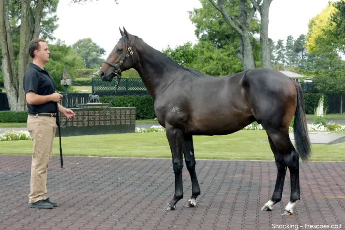 SHOCKING (AUS) (Bay 2005-Stud 2011). 7 wins from 1300m to 3200m, VRC Australian Cup, Gr.1. Sire of 174 rnrs, 82 wnrs, inc. SW Fanatic (New Zealand Oaks, Gr.1), Chocante, The Hassler - Circuit Hassler (H.K.), Shocking Luck - Zilong (H.K.), Formidable - Tianchi Monster (H.K.), Pure Pride, SP Camino Rocoso, Hello M'Lady, Antonio Giuseppe, Megawatt, Mental Telepathy, Electric Aura, High Class and of Scandalo, etc. 1st dam FRESCOES, by Lonhro. 2 wins from only 3 starts at 1100m in Aust. Three-quarter-sister to MENTAL , half-sister to Kisani . This is her third foal. Her second foal is a 2YO. Dam of one foal to race. 2nd dam SUNBEAM, by Grand Lodge. Raced once. Three-quarter-sister to FREEMASON , half-sister to SASHED (dam of SANTISSIMA ), ASARKA , BRADSHAW , Sivensa , Yseult , Intrigues (dam of MENTAL ), Majestic (dam of TARZI ), Ashajest (dam of DEBRIEF ). Dam of 8 named foals, 5 to race, 3 winners, inc:- Kisani (Viscount). 4 wins 1200m to 1350m, 3d Ipswich TC Gai Waterhouse Classic, L . Producer. Minh Khai. 8 wins 1450m to 2200m, ATC Become an Sponsor H., TABRewards H., Hyland Race Colours H., 2d VRC Jimmy Demetriou & Brian Kelly H. 3rd dam SHAYBISC , by Biscay. Champion 2YO & 3YO filly in Aust/NZ. 9 wins-6 at 2-from 900m to 2000m, AJC Sires' Produce S., Gr.1, Frank Packer P., Gr.2 , Hobartville S., Gr.2 , STC Reisling Slipper Trial S., Gr.3, AJC Light Fingers S., L , Widden S., L, 2d STC George Ryder S., Gr.1 , Canterbury S., Gr.2 . Sister to Sanction , three-quarter-sister to Influence (dam of UNDUE , ABSURD ), half-sister to Jeckale (dam of MALIBU MAGIC ), Neensie (dam of SOLAR CIRCLE ). Dam of 14 foals, 12 to race, 11 winners, inc:- SASHED (Sir Tristram). 2 wins-1 at 2-at 1000m, 1300m, A$106,020, AJC San Domenico S., Gr.2 , 2d STC Tea Rose S., Gr.2 . Dam of 6 winners- FREEMASON (Grand Lodge). 7 wins-1 at 2-1600m to 2400m, A$3,492,540, STC BMW S., Gr.1 , QTC TJ Smith Classic, Gr.1 . BRADSHAW (Last Tycoon). 9 wins-1 at 2-at 1000m, 1100m, A$628,670, AJC Shorts H., Gr.3 , STC Star Kingdom S., Gr.3 -twice, AJC June S., L . ASARKA (Crown Jester). 9 wins-2 at 2-to 1400m, A$140,530, STC Todman Slipper Trial S., Gr.3 , AJC Canonbury S., L , 2d STC Silver Slipper S., Gr.2 . Yseult (Sir Tristram). 4 wins 1400m to 1900m, STC Castle Canned Hams H., Night Raid Cup, 3d NSW Tatt's RC Tattersall's Club Cup, L . Producer. Sivensa (Crown Jester). Winner at 1000m, AJC Windbag H., 2d AJC Sir Brian Crowley S., L , 3d STC Sir Dapper S., L , 4th AJC San Domenico S., Gr.2 . Intrigues. 2 wins at 1000m, 1100m, STC View Clubs of Australia H. Dam of- MENTAL (Lonhro). Leading Older Male on the 2013 WTR (Sprint). 8 wins from 1200m to 1600m, in Aust. and U.A.E, VRC Patinack Classic, Gr.1 . Majestic. 2 wins at 1200m, 1290m, STC Kogarah H. Dam of 7 winners- TARZI (Desert Prince). 11 wins-2 at 2-1200m to 1600m, A$1,152,730,WATC AJ Scahill S., Gr.3 , Hyperion S., Gr.3 , 2d WATC Railway S., Gr.1 . Ashajest. Winner at 1000m in Aust. Dam of 7 winners- DEBRIEF (Brief Truce). 7 wins-1 at 2-1200m to 1400m, MRC Victoria H., Gr.3 -twice, 2d AJC Hobartville S., Gr.2 , 3d SAJC Goodwood H., Gr.1 . |