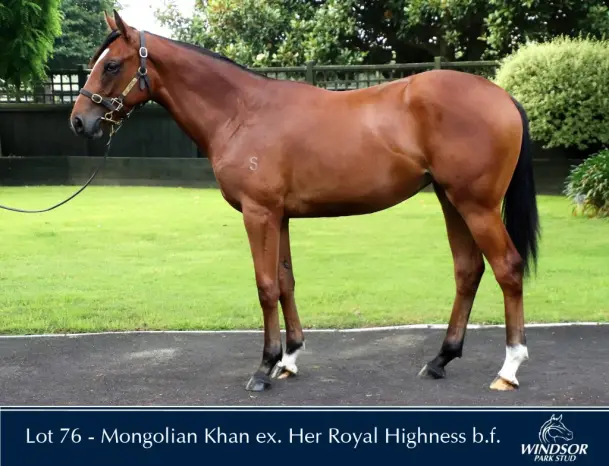 MONGOLIAN KHAN (AUS) (Bay 2011-Stud 2016). Horse of the Year & Champion Stayer in NZ in 2014-15 & 2015-16. Champion 3YO in NZ in 2014-15. 8 wins from 1400m to 2400m, NZ$625,500, A$3,363,250, New Zealand Derby, Gr.1, Australian Derby, Gr.1, MRC Caulfield Cup, Gr.1, Avondale Guineas, Gr.2, Waikato Guineas, Gr.2. Half-brother to SW Young Centaur (Wellington Cup, Gr.1). His oldest progeny are yearlings. 1st dam HER ROYAL HIGHNESS , by Volksraad. 3 wins at 1600m, NZ$88,735, Wairarapa Thoroughbred Breeders' S., L , Manawatu RC Lindauer Brut Cuvee H., 2d ARC Westbury Classic, L , Waikato RC Ag & Turf Sprint H., L . Sister to CAPTAIN'S COMMAND (dam of SWEET CHEEKS ), Inshelucky . This is her sixth foal. Her fifth foal is a 2YO. Her fourth foal is an unraced 3YO. Dam of two foals to race, inc:- KINGSGUARD (g. by Rip Van Winkle). 5 wins 1400m to 1600m, NZ$15,100, A$435,950, to 2017-18, Hawkesbury Gold Cup, Gr.3 , ATC Spring Preview H., Theraces H., Pluck at Vinery H., Tab.com.au H., 2d ATC Shannon S., Gr.2 , Hawkesbury RC Rowley Mile H., L , ARC New Zealand Herald S.,ATC Ranvet H., TAB Rewards P., 3d Scone Cup, L , VRC York RacecourseH. 2nd dam GRAND PRINCESS, by Last Tycoon. Winner at 1000m in Aust. Half-sister to Bouzy . Dam of 10 named foals, 9 to race, 6 winners, inc:- HER ROYAL HIGHNESS (Volksraad). 3 wins. See above. CAPTAIN'S COMMAND (Volksraad). Winner at 2 at 1000m, Otago RC Champagne S., L . Dam of 3 winners- SWEET CHEEKS (General Nediym). Winner at 2 at 1000m, A$103,000, VRC Maribyrnong Trial S., L , 2d VRC Maribyrnong P., Gr.3 . Dam of- Lord Macau - Casino Mok (Mac.). 3 wins-1 at 2-at 1400m, 1600m, A$136,030, M$123,700, to 2017-18, ATC Theraces H., Tab.com.au P. Inshelucky (Volksraad). 3 wins at 1200m, Matamata RC Heather McFarlane S., 2d Counties Bowl, L , 3d Waikato RC Sprint H., L . Dam of 3 winners- Beauty Apps - Beauty Journey (H.K.). 3 wins at 1400m in NZ and HK, HKJC Panasonic 4K Wearable Camera H., Big Profit H. Rattan. 6 wins at 1400m, 1600m, HK$8,368,050, to 2018-19, HKJC Panasonic Cup, Garden Road H., Vengeance of Rain H., Tak Wah H. Aladdin Prince. 3 wins-1 at 2, WRC Baseline H., 4th WRC Wellesley S., L . 3rd dam GRAND JETTE , by Spectacular Love. 4 wins-2 at 2-800m to 1400m, Taranaki 2YO Classic, Gr.3 , WATC Toyota Paseo H., 3d Manawatu Sires' Produce S., Gr.1 . Dam of 7 foals, all raced, 5 winners, inc:- Bouzy (Catbird). Winner at 1479m, 3d SAJC Walter Brown S.H., L . 4th dam NUALA GIRL, by Taipan II. Raced once. Half-sister to Briny Girl (dam of NOBLE CAPTAIN ). Dam of 9 foals, all raced, 5 winners, inc:- GRAND JETTE (Spectacular Love). 4 wins. See above. Puissance. 3 wins-2 at 2-800m to 1600m. Grandam of- CHALAEV - DUJARDIN (Sing.) (Magic Ring). 7 wins 1400m to 2000m, NZ$13,175, S$521,617, Singapore TC New Year Cup, L , Woodlands Classic S., L , 3d Singapore TC Colonial Chief S., L . |