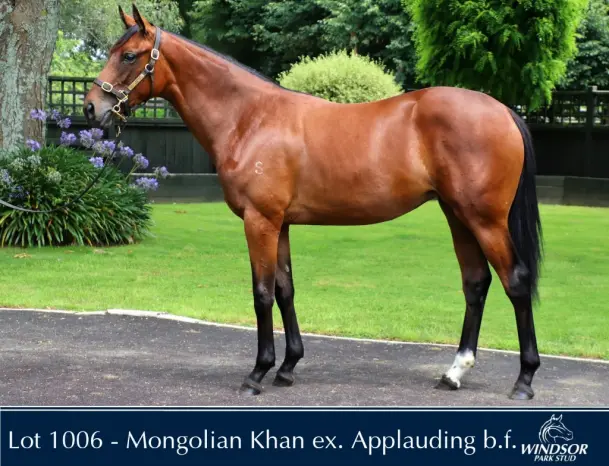 MONGOLIAN KHAN (AUS) (Bay 2011-Stud 2016). Horse of the Year & Champion Stayer in NZ in 2014-15 & 2015-16. Champion 3YO in NZ in 2014-15. 8 wins from 1400m to 2400m, NZ$625,500, A$3,363,250, New Zealand Derby, Gr.1, Australian Derby, Gr.1, MRC Caulfield Cup, Gr.1, Avondale Guineas, Gr.2, Waikato Guineas, Gr.2. Half-brother to SW Young Centaur (Wellington Cup, Gr.1). His oldest progeny are yearlings. 1st dam APPLAUDING, by Pentire. Unplaced. Half-sister to Bound to Impress (dam of ALIBI ). This is her third foal. Her second foal is a 2YO. Her first foal is an unraced 3YO. 2nd dam HONOR BOUND , by Honor Grades. 6 wins 1200m to 1600m, NZ$265,050, ARC Easter H., Gr.1 , Highview Stud Trophy, Gr.2 , BOP RC Hank Verryt Car Sales 3YO H., ARC Racing Annual H., Marvellous Melbourne H., 2d Waikato Draught Sprint, Gr.1 , Cambridge JC Travis S., Gr.2 , Waikato RC Windsor Park Sprint H., L , 3d Manawatu RC Eulogy S., Gr.3 , 4th Te Aroha JC New Zealand Thoroughbred Breeders' S., Gr.1 , Counties RC AucklandThoroughbred Breeders' S., Gr.2 . Half-sister to GREENBACK , Lady in Blue (dam of BEAU BRUMMELL ). Dam of 10 foals, all raced, 7 winners, inc:- Bound to Impress. 2 wins at 1670m, 2000m, 3d Taranaki RC Nicholas Finance H. Dam of 3 winners- ALIBI (Darci Brahma). 7 wins to 1600m, S$935,976, Singapore TC Patron's Bowl, L , Stewards' Cup, L , 2d Singapore TC Lion City Cup, L , SaasFee S., L , 3d Singapore TC Jumbo Jet Trophy, L , 4th Singapore Derby, L . Yellen. 4 wins 1400m to 1700m, A$161,770, VRC Red Rock Deli H. Honorjeu. Unplaced. Dam of 2 winners- Tahsin. 4 wins at 1600m, A$117,255, to 2017-18, ATC TAB Rewards H. 3rd dam AMRICA , by Amalgam. 6 wins-3 at 2-1100m to 2000m, Manawatu Breeders' S., Gr.3 , Wellington S., Gr.3 , HBJC London Woolbrokers' H., 2d New Zealand Oaks, Gr.1 , WRC Summer H., L , Wellington Racing Club H., L , 3d HBJC Gold Trail S., Gr.3 , WRC North Island Challenge S., L . Half-sister to IMPERIAL DIAMOND - AMERICAN SOLDIER II (Mal.), Prince Lochinvar , Amy Annie . Dam of 8 foals, 7 to race, 4 winners, inc:- HONOR BOUND (Honor Grades). 6 wins. See above. GREENBACK (McGinty). 9 wins-3 at 2-880m to 2225m, NZ$94,970, A$153,860, WRC Evergreen Lodge S., Gr.2 , Qld Tatt's RC Tattersall's Cup, Gr.3 , Murrumbidgee TC Wagga Gold Cup, L , 3d WRC Thorndon Mile, Gr.1 , Wellington S., Gr.3 , 4th WRC Thompson H., Gr.3 . Lady in Blue. Unraced. Dam of 6 winners- BEAU BRUMMELL (My Halo). 7 wins at 1100m, 1200m, S$480,212, Singapore TC Merlion Trophy, L , Class 1 H., 3d Singapore TC Three Rings Trophy, L , 4th Singapore TC Juvenile Championship, L . 4th dam FABRICA, by Oakville. Unplaced. Dam of 11 foals, 10 to race, 8 winners, inc:- AMRICA (Amalgam). 6 wins. See above. IMPERIAL DIAMOND - AMERICAN SOLDIER II (Mal.) (Imperial Seal). 11 wins-1 at 2-1000m to 1400m, Perak TC Sultan's Gold Vase, L . |