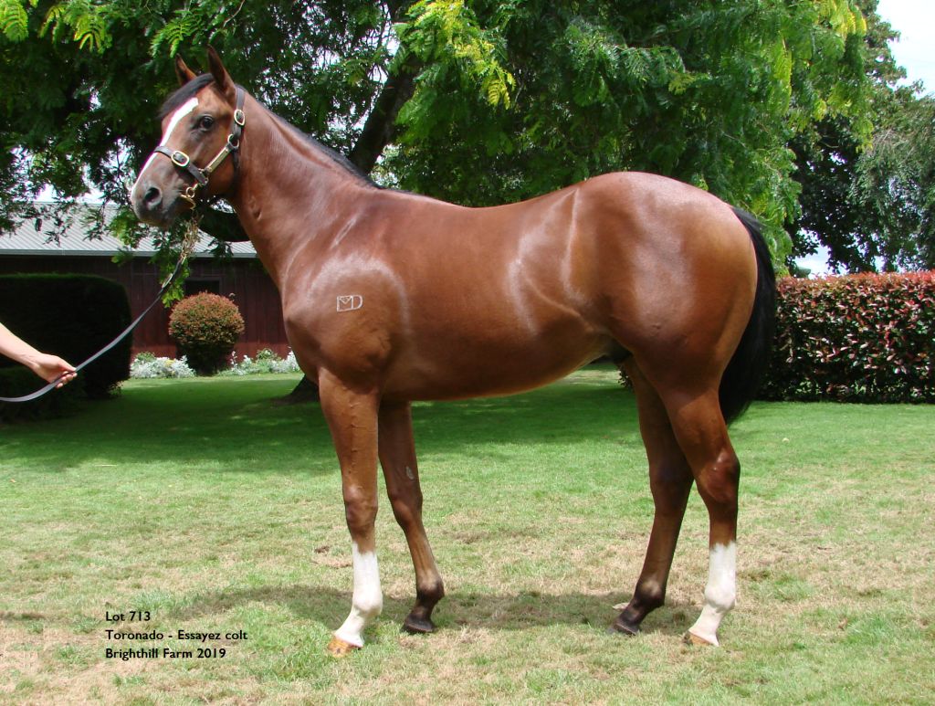 TORONADO (IRE) (Bay 2010-Stud GB 2015, Aust. 2015). 6 wins-3 at 2, Royal Ascot Queen Anne S., Gr.1. Out of a half-sister to SW Casamento. Sire of 55 rnrs, 22 wnrs. His oldest SH-bred progeny are 2YOs. His NH-bred progeny inc SP Almufti, Revelstoke, Watan, Baylagan, El Ingrato and of Droit de Parole, Tuned, Mon Ouragan, Topical, Yolo Again, Eesha's Smile, Chasing the Rain, Festina Plente, Illusions, Korcho, Taos, etc. 1st dam ESSAYEZ, by Excellent Art. 3 wins at 2 at 1000m, 1100m, A$119,550, WATC Caroma 2YO P., Westspeed 2YO P.-twice. This is her first foal. 2nd dam SCHUCKMANNSBURG, by Rock of Gibraltar. Placed at 3. Half-sister to Emaurismo (dam of SPRING HEAT ). Dam of 4 named foals, all winners- Our Little Miracle. 2 wins at 1300m, 1400m, 2d ATC Perfection Landscapes Walk 4 Nathan P., Cornucopia Committee Inc H., 3d ATC Hyland Race Colours H., MRC Bushnell Outdoor Products H., Polytrack H. Real Ordeal. Winner at 1100m in 2018-19 in Aust. Ikaba. Winner at 1108m in 2017-18 in Aust. 3rd dam KATIMA , by Zeditave. 4 wins-2 at 2-at 1000m, 1200m, A$260,640, AJC Silver Shadow S., Gr.2 , Brian Crowley S., L , Keith Mackay H., L , Gimcrack S., L , 3d NSW Tatt's RC Furious S., Gr.3 , 4th STC Sweet Embrace S., Gr.3 . Half-sister to Keeping Up , Talent Time (dam of DEFERENTIAL , EUSEBIO ). Dam of 9 foals, 7 to race, 3 winners, inc:- Island Speed. 8 wins-at 1000m, 1200m, HKJC Ventris H. Silent Predator. 6 wins 1200m to 1400m, 2d AJC Randwick 150th Anniversary H. Emaurismo. Unraced. Dam of 5 winners- SPRING HEAT (More Than Ready). 2 wins at 1300m, 1400m in 2017-18, ARC Bonecrusher S., Gr.3 , 4th ARC Eight Carat Classic, Gr.2 . Southern Girl. 2 wins at 1000m, A$85,625, 2d ATC Membership on Sale H., Lynne McLean H., XXXX Gold H., 4th ATC Triscay S., Gr.3 . 4th dam KIBITKA, by Luskin Star. Unplaced. Half-sister to Twisted Heart (dam of SPEED BABY ), Secret Desire (dam of SECRET LIAISON ). Dam of 9 foals, all raced, 8 winners, inc:- KATIMA (Zeditave). 4 wins. See above. Keeping Up (Quest for Fame). Winner at 2 at 1100m, STC Garden Island 2YO H., 2d STC Bravery 2YO H., 3d STC Magic Night S., Gr.2 . Producer. Miss Portofino. 3 wins to 1400m, AJC CVD Golf Club H. Dam of 3 winners- Anjaal (Lonhro). 2 wins-1 at 2-at 1400m, 1600m, R320,200, 3d Greyville Premier's Champion S., Gr.1 , 4th Greyville Golden Horseshoe S., Gr.1 . Talent Time. 3 wins at 1400m, 2000m in Aust. Dam of 4 winners- DEFERENTIAL (Royal Academy). 2 wins-1 at 2-at 1200m, A$288,325, HK$1,574,500, STC Pago Pago S., Gr.2 , 2d VRC Maribyrnong P., Gr.3 . EUSEBIO (Benfica). 5 wins-1150m to 1400m, A$234,925, to 2017-18, Canberra Guineas, L , ATC Thanks Owners H. La Camille. Winner at 1007m in Aust. Dam of 5 winners- Goldstone (Shamardal). 4 wins 1150m to 1280m, A$275,313, AJC Members' Terraces H., ATC Xirrus H., 2d VRC Carbine Club S., Gr.3 . |