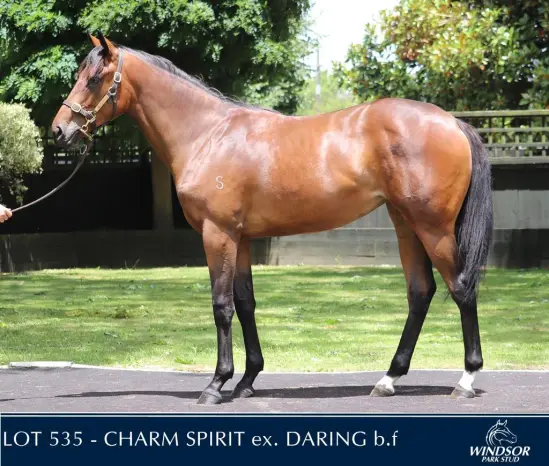 CHARM SPIRIT (IRE) (Bay 2011-Stud GB 2015, NZ 2015). 6 wins-1 at 2, Ascot Queen Elizabeth II S., Gr.1. Leading NZ First Season Sire in 2018-19. Sire of 177 rnrs, 85 wnrs. His oldest SH-bred progeny are 3YOs and inc SW Aretha (Matamata Breeders S., Gr.2), Fascino, SP Heirborn, Jager Bombed and of Sansom, Moreno, Intimidate, Peloton, etc. His NH-bred progeny inc SW Kick On, Yourtimeisnow, SP Charming Kid, etc. 1st dam DARING, by Encosta de Lago. Winner at 1469m, 3d MVRC Vic Wide Towing H. Three-quarter-sister to ORDER OF THE SUN , RISK AVERSION , Subsequent (dam of SUMMER PASSAGE ). This is her second foal. Her first foal is an unraced 3YO. 2nd dam Liatris , by Rock of Gibraltar. 3 wins-1 at 2-at 1200m, 1400m, 2d Matamata Breeders' S., Gr.2 , 4th Otago RC New Zealand Bloodstock Insurance S., L . Three-quarter-sister to SHANIA DANE , SCINTILLATION , Danevade (dam of NORTHWEST PASSAGE ), Puzzle Book , half-sister to RISK AVERSION , Sequin (dam of BEAUTY , GET TO WORK , ORDER OF THE SUN ). Dam of 5 named foals, all raced, 3 winners, inc:- Winter Passage. 3 wins-1 at 2-1000m to 1110m, A$125,100, to 2018-19, BRC Doreen Bird P., 2d BRC Hamilton Reach H., Events H. Hebrung. 2 wins at 1000m, A$77,935, VRC RSL P. 3rd dam SUBTERFUGE, by Machiavellian. Winner at 2 at 7f, Newmarket Dexa'Tex S. Half-sister to SANDMASON , SARDEGNA (dam of SARDONIC ), Spa (dam of PERSIAN MAJESTY ). Dam of 12 foals, 11 to race, 9 winners, inc:- SHANIA DANE (Danehill). 5 wins-3 in succession-1200m to 1500m, A$846,450, STC Phar Lap S., Gr.2 , Premiere S., Gr.2 , AJC South Pacific Classic, Gr.3 , 2d AJC George Main S., Gr.1 , 3d VRC Emirates S., Gr.1 . SCINTILLATION (Danehill). 12 wins-1 at 2, HKJC Sha Tin Sprint Trophy, L . RISK AVERSION (Encosta de Lago). 5 wins-4 in succession-1030m to 1350m, A$215,000, BRC Juanmo S., L , 2d ATC Millie Fox S., Gr.3 . Danevade (Danehill). 3 wins at 1400m, 2d VRC Matron S., Gr.3 . Dam of- NORTHWEST PASSAGE (So You Think). 5 wins-3 in succession-1300m to 2500m, Moonee Valley Night Cup, L , TRC Tasmanian Derby, L . Sequin. Placed at 3 in Aust. Dam of 6 winners- ORDER OF THE SUN (Encosta de Lago). 11 wins 1200m to 2800m, A$262,665, 72,180Rgt., S$366,567, VRC St Leger, L . BEAUTY (Smart Missile). 3 wins in succession-1 at 2-1100m to 1200m, A$117,900, to 2018-19, MVRC William Crockett S., L . GET TO WORK (Snippets). Winner at 2 at 1000m, SAJC Cinderella S., L . Subsequent. Winner at 1520m in Aust. Dam of- SUMMER PASSAGE (Snitzel). Top Male on The 2016-17 NZ 2YO Free H. 2 wins at 2 at 1200m, ARC Diamond S., Gr.1 . Sequential. Unraced. Dam of 4 winners- EXCITABLE BOY (More Than Ready). Winner at 2 at 1000m, A$98,150, HK$840,000, VRC Festival of Racing S., L . Hides. Unraced. Grandam of- MAN FROM UNCLE (Uncle Mo). 3 wins 1000m to 1400m, A$426,500, ATC Hobartville S., Gr.2 , Eskimo Prince S., Gr.3 . |