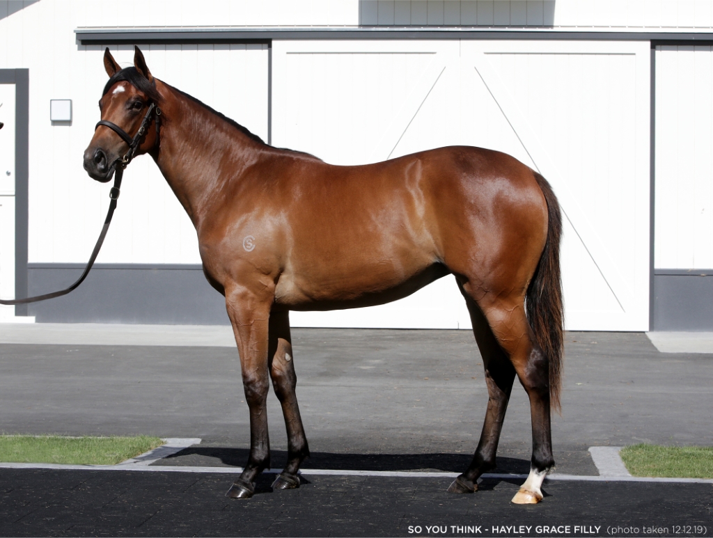 SO YOU THINK (NZ) (Bay or Brown 2006-Stud 2012). 14 wins-1 at 2, MVRC WS Cox P., Gr.1-twice. Sire of 452 rnrs, 278 wnrs, 22 SW, inc. SW La Bella Diosa (New Zealand One Thousand Guineas, Gr.1), Nakeeta Jane, Sopressa, D'Argento, Inference, Gold Rush, Quick Thinker, So Si Bon, Thought of That, Coachwhip, Heavenly Thought, Higher Ground, Think Bleue, The Pinnacle, Northwest Passage, Just Thinkin', Long Jack, etc. 1st dam HAYLEY GRACE, by Thorn Park. 2 wins at 1200m, 1600m, 2d BOP RC Taste of Asia Mt Maunganui H., ARC Shamrock Recruitment H., Waikato RC Greene Racing H., 3d BOP RC Phil Mangos-Bayleys Country H. Half-sister to BAK DA CHIEF (dam of TE AKAU SHARK ), Bak da Princess (dam of PONDAROSA MISS , ECUADOR ). This is her first foal. 2nd dam Havitbak , by Bakharoff. 8 wins 1200m to 2100m, ARC Peter Lehmann Wines H., Waikato RC Sitrite Furniture H., Cambridge Thoroughbred Sales H., 2d Waikato RC Mapperley Stud S., Gr.3 , 3d Rotorua Challenge P., Gr.3 , 4th BOP RC Kiwifruit Cup, L . Dam of 8 foals, 7 to race, 6 winners- BAK DA CHIEF (Chief Bearhart). 5 wins 2000m to 2400m, NZ$136,125, Waikato Gold Cup, Gr.2 , Otaki Maori RC St Leger Trial, ARC Captain Rio H., 2d Northland Cup, 3d Wanganui Cup, L . Dam of 3 winners- TE AKAU SHARK (Rip Van Winkle). 5 wins-3 in succession-1100m to 1600m, NZ$262,250, A$599,750, to 2018-19, CJC Coupland's Bakeries Mile, Gr.2 , Hawkes Bay Spring Sprint H., Gr.3 , 2d ATC Epsom H., Gr.1 , Tramway S., Gr.2 , Waikato RC Foxbridge P., Gr.2 , 3d MVRC WS Cox P.,Gr.1 , 4th New Zealand Two Thousand Guineas, Gr.1 . Riverina Girl. Placed. Dam of 2 winners- Eclair Journey (Guillotine). 2 wins at 1350m, 1510m in Macau, 3d Macau 4YO Prelude, L , Macau Guineas, L , 4th Macau Derby, L . Bak da Princess. Unraced. Dam of 6 winners- PONDAROSA MISS (High Chaparral). 6 wins 1400m to 2100m, NZ$271,635, ARC Easter H., Gr.1 , Coca-Cola H., Simply Squeezed H., 2d Rotorua Challenge P., L , 3d ARC Zabeel Classic, Gr.1 , Auckland Cup, Gr.1 , 4th ARC Avondale Cup, Gr.2 . ECUADOR (High Chaparral). 10 wins 1400m to 2400m, A$1,136,875, ATC Lord Mayor's Cup, L , Carrington S., L , WJ McKell Cup, L , December H., Eremein H., 2d ATC Epsom H., Gr.1 , NSW Tatt's RC Tramway S., Gr.2 , ATC Doncaster Prelude H., Gr.3 , MVRC JRA Cup, Gr.3 , Hawkesbury Gold Cup, Gr.3 , ATC Lord Mayor's Cup, L , 3d MRC CF Orr S., Gr.1 , Futurity S., Gr.1 , ATC Warwick S., Gr.2 . 3rd dam GOLD NADJAN, by Nadjar. Unraced. Half-sister to ELGAY , DANIELA UMBRA , Golden Moony . Dam of 4 foals, all raced, 2 winners, inc:- Havitbak (Bakharoff). 8 wins. See above. 4th dam GOLD REEF, by Reliance. Unplaced. Half-sister to RICHBOY , Gilded Lily (dam of GARDE A VOUS ). Dam of 7 foals, 5 to race, all winners, inc:- ELGAY (Gay Lussac). 6 wins 1600m to 2400m in France and Italy, Derby Italiano, Gr.1 , 2d Milan Gran Premio d'Italia, Gr.1 . Sire. |