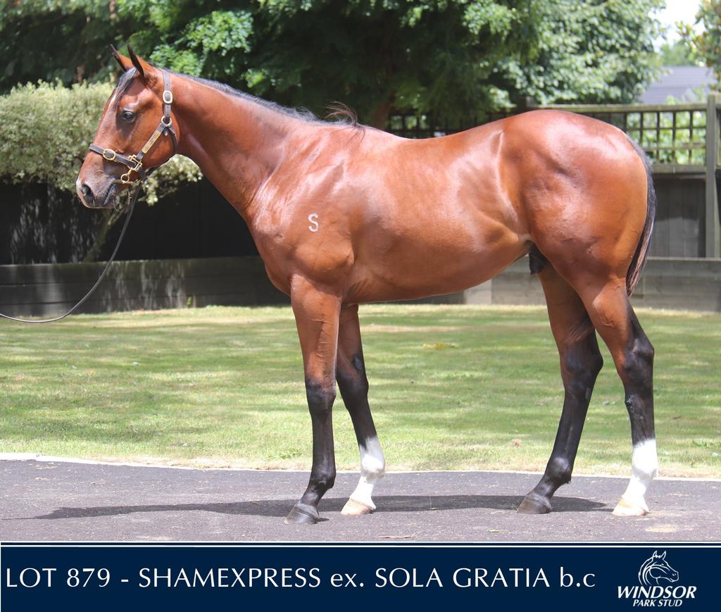 SHAMEXPRESS (NZ) (Bay 2009-Stud 2014). 3 wins-1 at 2-to 1200m, VRC Newmarket H., Gr.1. Leading NZ First Season Sire in 2017-18. Sire of 62 rnrs, 31 wnrs, inc. SW Embrace Me (MVRC Typhoon Tracy S., Gr.3), Cyber Attack, London Express, Qiji Express, SP Diva Express and of Hard Press, Tiny Terror, Xpressmymind, Qiji Swordsman, Choctoc, Gunga Din, Kaipaki, Coventina Bay, Eokalio, Grand Bernini, Lucky Mission, etc. 1st dam SOLA GRATIA, by Black Minnaloushe. Winner at 1600m. This is her sixth foal. Her fifth foal is a 2YO. Her fourth foal is an unraced 3YO. Dam of two foals to race- Plowshare (g. by Guillotine). Winner at 1200m, 3d Southland RC Plumbers & Building Services H. Thewayyoumademe (g. by Thewayyouare). Placed to 2019-20. 2nd dam REVELATIONS, by Danske. Unraced. Sister to DANTE'S PARADISO , half-sister to KAPITAIN KASH , Lord Vader , Exodus (dam of AEROVELOCITY ), Moniette (dam of MA CHOIX ). Dam of 5 foals, 4 to race, 3 winners, inc:- Shroud. 3 wins at 1200m, 1400m, CJC Millennium Hotels Resorts H., 2d CJC Echoes of Heaven at Linwod Park H.-twice, 3d CJC Lindauer H. 3rd dam LADY GENESIS, by Star Way. 2 wins at 1600m, AJC Maidenhead H. Three-quarter-sister to NIMUE , SMILING LIKE , (MR) EUROSTAR , Usha , half-sister to Eustaci (dam of SIRSTACI ). Dam of 15 named foals, 12 to race, 8 winners, inc:- KAPITAIN KASH (Kaapstad). 9 wins 1400m to 2300m, NZ$170,275, Counties Cup, Gr.2 , Rotorua Cup, Gr.3 , ARC Body Bronze H., Waikato RC ZHFM H., ARC Support-a-Paedic H., McGinty H., Waikato RC Atlanta Golf Cambridge H., 4th Auckland Cup, Gr.1 , Counties RC Metric Mile, L . DANTE'S PARADISO (Danske). 5 wins-4 in succession-1500m to 2000m, A$164,150, NSW Tatt's RC Tattersalls Club Cup, L , AJC Motor NeuroneDisease P., STC BMW 5 Series H., West Ashfield H., 2d AJC Villiers S., Gr.2 . Lord Vader (Grosvenor). 6 wins 1400m to 1900m, STC Campbellfield H., 3d STC Parramatta Cup, L , 4th NSW Tatt's RC Tattersall's Club Cup, L . Exodus. Winner at 1600m. Dam of 2 winners- AEROVELOCITY (Pins). Champion Sprinter in Hong Kong in 2014-15 & 2016-17. 12 wins-5 in succession-at 1200m, 1300m, NZ$7,810, S$570,000, HK$35,474,750, 98,780,000Â¥ in NZ, Singapore, HK and Japan, Hong Kong Sprint, Gr.1 -twice, Chukyo Takamatsunomiya Kinen, Gr.1 , Singapore TC Krisflyer International Sprint, Gr.1 , HKJC Centenary Sprint Cup, L , Premier Bowl H., L , Sha Tin Vase, L , 2d HKJC Chairman's Sprint Prize, L , Prince Jewellery & Watch Premier Cup, L , 3d HKJC Premier Bowl H., Gr.2 , Jockey Club Sprint, Gr.2 . Captivating. Winner at 1200m. Grandam of- Rich'n Unhitched (Bachelor Duke). 5 wins at 1200m, 1400m, NZ$86,225, A$22,620, ARC VRC Trophy, Whangarei RC LJ Hooker Michael Springford Memorial H., 2d ARC Darley P., Gr.3 . Moniette. Placed at 3 in Aust. Dam of- MA CHOIX (Choisir). 5 wins at 1600m, 1800m, R443,625, Kenilworth Victress S., Gr.3 , 3d Greyville East Coast H., L . |