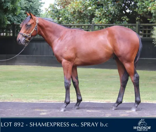 SHAMEXPRESS (NZ) (Bay 2009-Stud 2014). 3 wins-1 at 2-to 1200m, VRC Newmarket H., Gr.1. Leading NZ First Season Sire in 2017-18. Sire of 62 rnrs, 31 wnrs, inc. SW Embrace Me (MVRC Typhoon Tracy S., Gr.3), Cyber Attack, London Express, Qiji Express, SP Diva Express and of Hard Press, Tiny Terror, Xpressmymind, Qiji Swordsman, Choctoc, Gunga Din, Kaipaki, Coventina Bay, Eokalio, Grand Bernini, Lucky Mission, etc. 1st dam SPRAY, by Entrepreneur. Raced once. Half-sister to TORLESSE , Mystify , Mystique (dam of REPLIQUE ), Truthful . This is her twelfth foal. Her eleventh foal is a 2YO. Dam of nine foals to race, all winners- Corsage (f. by Volksraad). Joint second filly on 2008-09 NZ 2YO Free H. 3 wins-1 at 2-1100m to 1400m, NZ$142,675, S$132,432 in NZ and Singapore, 2d Ashburton RC Ray Coupland S., L , BOP RC Oak Tree Restaurant 3YO P., 3d ARC Diamond S., Gr.1 , Matamata Breeders' S., Gr.2 , ARC Sunline Vase, L , 4th New Zealand Two Thousand Guineas, Gr.1 , Hawkes Bay Gold Trail S., Gr.3 , Lowland S., Gr.3 . Dam of- AOTEA LAD (Savabeel). Winner at 2 at 1100m, NZ$275,400, in 2018-19, WRC Wakefield Challenge S., Gr.2 , 2d ARC Eclipse S., Gr.3 ,Matamata RC Slipper S., Gr.3 , ARC Karaka 2YO Million, RL , 3dHawke's Bay Guineas, Gr.2 , 4th Whangarei RC Northland Breeders' S., Gr.3 . Miss Thorn (f. by Thorn Park). 5 wins-1 at 2 and 3 in succession-at 1100m, 1400m, 3d Matamata Breeders' S., Gr.2 . Dam of 2 winners- Harry New Shoes. 3 wins 1200m to 1400m to 2018-19 in Aust. Cizen Boss. Winner at 1200m in 2019 in Singapore. Sunburst (f. by Mastercraftsman). 3 wins 1600m to 2100m to 2018-19, BOP RC Iline Construction H., Bayleys Mount Maunganui H. It's Got to be You (g. by Volksraad). 3 wins at 1400m, 1600m, 2d Thames Cup. Banksy (g. by Mastercraftsman). Winner at 1300m, 2d SCTC HMR Projects H. Gnarly - Above the Rainbow (Sing.) (g. by Golan). 2 wins to 1600m in Aust. Spritz (f. by Thorn Park). Winner at 1600m. Metro Park (f. by Thorn Park). Winner at 1400m in Aust. Variation (f. by Volksraad). Winner at 1600m. Dam of 2 winners- Banstead. Winner at 1550m, 3d WRC Kawi Cup. 2nd dam SEAMIST , by Beaufort Sea. 1990 Wrightson Southern Filly of the Year. 12 wins 1400m to 2000m, NZ$367,615, A$2,500, ARC New Zealand S., Gr.1 , BOP RC Japan-New Zealand International Trophy, Gr.2 , Waikato RC Highview Stud S., Gr.3 , Manawatu RC Awapuni Gold Cup, Gr.3 , Otago RC James Hazlett S.H., L , Dunedin Guineas, L , CJC Warstep S., L , Otago Mannequin S., L , Ashburton CRC Inglewood S., L , Gore Guineas, L , 2d WRC Thorndon Mile, Gr.1 , New Zealand One Thousand Guineas, Gr.1 , 3d ARC Easter H., Gr.1 , WRC Thorndon Mile, Gr.1 . Dam of 10 foals, 8 to race, 7 winners, inc:- TORLESSE (Volksraad). 12 wins-4 in succession-1200m to 3200m, NZ$287,775, A$38,300, New Zealand Cup, Gr.2 , CJC Gold Cup, Gr.3 , Spring Classic H., Gr.3 , Otago RC Dunedin Gold Cup, Gr.3 . Truthful (Trustful). 8 wins 1200m to 2130m, 3d CJC Timaru S., L . Mystique (Montjeu). 4 wins 1200m to 2000m, 2d CJC Warstep S., L . Dam of- REPLIQUE (Darci Brahma). 2 wins at 1400m, 1600m, Southland Guineas, L , CJC NZB Festival Sale H., 2d Otago RC Dunedin Guineas, L . Mystify (Montjeu). 3 wins at 1600m, 2500m, 2d Otago RC Dunedin Guineas, L . |