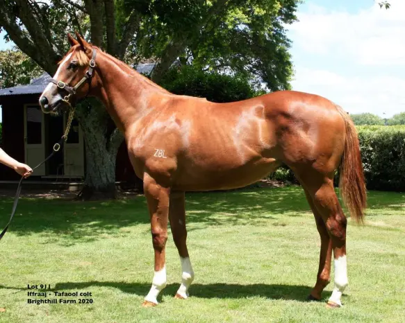 IFFRAAJ (GB) (Brown 2001-Stud 2007). 7 wins-1 at 2, Goodwood Lennox S., Gr.2. Leading NZ Sire of 2YOs in 2015-16. Sire of 1291 rnrs, 779 wnrs, 69 SW. His SH-bred progeny inc SW Gingernuts (New Zealand Derby, Gr.1), Jon Snow, Turn Me Loose, Fix, Serena Miss, Wyndspelle, Melt, Kisses, Order Again, The Soultaker - Bulb Elite (H.K.), etc. His NH-bred progeny inc SW Ribchester, Rizeena, Jungle Cat, Chriselliam, etc. 1st dam TAFAOOL, by Green Desert. Placed in GB and NZ, 3d Newmarket Snooker & Sporting Club S. Three-quarter-sister to MAQAASID , half-sister to ZAWRAQ , Mujabaha (dam of MAGNANIME ). This is her fourth living foal. Her third foal is a 2YO. Her second foal is an unraced 3YO. Her first foal isunraced. 2nd dam SUNDUS, by Sadler's Wells. Winner at 1¼m in GB. Half-sister to GHANAATI , MAWATHEEQ , RUMOUSH (dam of MUNTAZAH , TALAAYEB , WADILSAFA ), Eshaadeh (dam of MAQAASID ). Dam of 10 named foals, 8 to race, 5 winners, inc:- ZAWRAQ (Shamardal). 2 wins-1 at 2-at 7f, 1m, Leopardstown Two Thousand Guineas Trial, L , 2d Leopardstown Trigo S., L , Listowel S., L . Ghusoon. Placed at 3 in GB. Dam of 2 winners- Oh Wait (State of Play). 2 wins at 1300m, 1600m to 2019-20 in Chile, 3d Hipodromo Chile Clasico Guillermo del Pedregal Herrera, L . Mujabaha. Unraced. Dam of- MAGNANIME (Elusive City). 2 wins-1 at 2-at 1800m, Chantilly Prix Finlande, L , 2d Cagnes-sur-Mer Prix de la Californie, L . 3rd dam SARAYIR , by Mr. Prospector. 3 wins-2 at 2-6¾f to 1¼m, Newmarket Oh So Sharp S., L , Newcastle Virginia S., L , 4th Chepstow Golden Daffodil S., L . Sister to Bashayer , Wijdan , three-quarter-sister to NAYEF , half-sister to NASHWAN , UNFUWAIN , ALWASMI , MUKDDAAM , Manwah (dam of MUSTANFAR , TADRIS ). Dam of 14 foals, 10 to race, 7 winners, inc:- GHANAATI (Giant's Causeway). 3 wins in succession-1 at 2-at 7f, 1m, Royal Ascot Coronation S., Gr.1 , The One Thousand Guineas, Gr.1 . Producer. MAWATHEEQ (Danzig). 4 wins 1m to 1½m, £147,415, Ascot Cumberland Lodge S., Gr.3 , 2d Newmarket Champion S., Gr.1 . Sire. RUMOUSH (Rahy). 2 wins-1 at 2-at 1m, 9f, Newmarket Feilden S., L , 2d Doncaster Park Hill S., Gr.2 , 3d The Oaks, Gr.1 . Dam of 4 winners- MUNTAZAH (Dubawi). 4 wins-1 at 2-1400m to 1600m to 2018-19 in GB and U.A.E, Meydan Firebreak S., Gr.3 , Burj Nahaar S., Gr.3 . TALAAYEB (Dansili). 2 wins-1 at 2-at 7f, £134,434, York City of York S., Gr.3 . Eshaadeh. Raced twice. Dam of 2 winners- MAQAASID (Green Desert). 2 wins at 2 at 5f, £135,558, Royal AscotQueen Mary S., Gr.2 , 3d Newmarket Cheveley Park S., Gr.1 .Producer. Jumooh. Placed, 3d Deauville Prix de la Perdriere. Dam of 3 winners- SHRAAOH (Sea the Stars). 4 wins 2050m to 3200m, to 2018-19, ATCSydney Cup, Gr.1 , 2d ATC Chairman's H., Gr.2 , Randwick City S., L . Istishaary. Unraced. Dam of- IL FORNAIO (Orpen). 4 wins 1200m to 1600m in Argentina, San Isidro G.P. San Isidro, Gr.1 , 2d San Isidro G.P. Estrellas Mile, Gr.1 . |