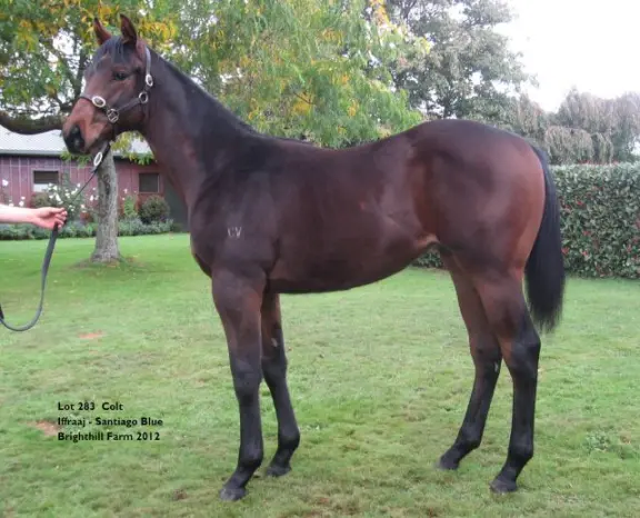 1st dam SANTIAGOBLUE, by Relaunch. Winner at 6f in U.S.A. Half-sister to CRISTOBAL. This is her ninth foal. Her eighth foal is a 2YO. Dam of seven foals to race, four winners, inc:- Linagix (c. by Linamix). 2 wins at 1500m, 1600m, Deauville Prix de Flins Sur Seine, 2d Longchamp Prix de l'Ete, 3d Chantilly Prix du Pain de Sucre, Saint-Cloud Prix Hauban. Sanajiyr (c. by Red Ransom). Winner at 1600m, Chantilly Prix de la Croix des Ormeaux. Santiaga (f. by Deputy Commander). Winner at 1800m, 3d Fontainebleau Prix de la Haute Borne. Dam of- Santacruceña. Winner at 1100m in 2011-12 in Chile. Safety Belt. Winner at 2 in 2011-12 in Arg. S Grillo(c. by Val Royal). 4 wins-1 at 2-to 1400m to 2011 in Spain. Cubana (f. by Linamix). Placed at 3, 3d Chantilly Prix du Temple de Venus. 2nd dam BALENCIAGA, by Gulch. Raced once. Three-quarter-sister to Hussonet, Fleet Marguerite (dam of BLIMEY O'REILLY - UPSIDE OF ANGER(H.K.), FLAG OFFICER), half-sister to EKRAAR. Dam of 7 foals, all raced, 5 winners, inc:- CRISTOBAL(Aptitude). 6 wins from 1700m to 2500m, US$97,074, â¬126,500 in France and U.S.A, Toulouse Prix Max Sicard, L, Deauville Prix Vulcain, L, 3d Deauville Prix de Reux, L, 4th Longchamp Prix du Lys, Gr.3. Valentini. Winner at 2 in U.S.A. Dam of- BostonGirl(Not for Sale). 2 wins at 1400m in 2011-12 in Arg, 3d Palermo Clasico Republica Oriental del Uruguay, Gr.3. Harbor Song(Sultry Song). 3 wins-1 at 2-at 1200m, 1400m in Arg, 2d La Plata Clasico Jockey Club Argentino, L. 3rd dam SACAHUISTA, by Raja Baba. Champion 3YO filly in USA in 1987. 6 wins-4 at 2-from 6f to 1¼m, US$1,298,842, Breeders' Cup Distaff S., Gr.1, Keeneland Spinster S., Gr.1, Santa Anita Oak Leaf S., Gr.1, Saratoga Adirondack S., Gr.2, Schuylerville S., Gr.3, 2d Hollywood Oaks, Gr.1, Del Mar Futurity, Gr.1, Hollywood Starlet S., Gr.1. Half-sister to FAR FLYING(dam of DALHART, ROSE FRANCES), Johns Treasure, Letty's Pennant(dam of R. ASSOCIATE), Banner Dancer (dam of GOLD STREAMER). Dam of 13 foals, 11 to race, 9 winners, inc:- EKRAAR(Red Ransom). 8 wins-1 at 2-from 1400m to 2400m, Milan GranPremio del Jockey Club, Gr.1, Goodwood Vintage S., Gr.3, Select S., Gr.3, Haydock Rose of Lancaster S., Gr.3, 2d Hong Kong Vase, Gr.1.Sire. Hussonet(Mr. Prospector). 2 wins at 2, Aqueduct Allowance, 3d Aqueduct Safe Ground S., L, Count Fleet S., L. Champion sire. |