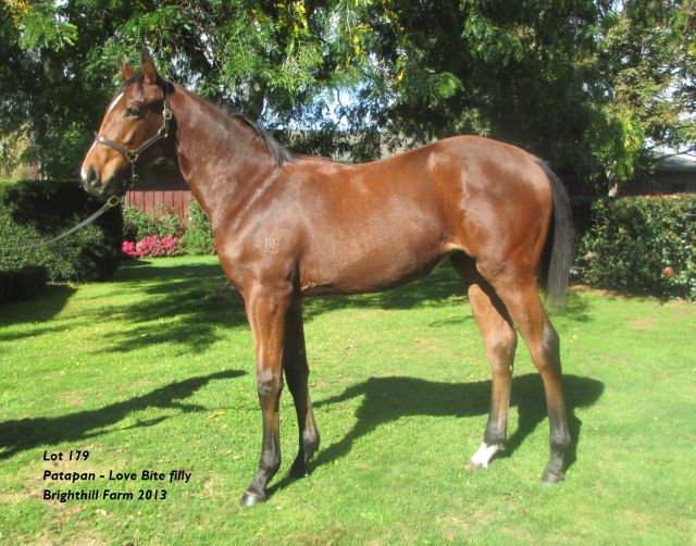 1st dam LOVE BITE, by Germano. 3 wins at 2000m, 2100m. Half-sister to TICKLISH. This is her third foal. Her second foal is a 2YO. Her first foal is an unraced3YO. 2nd dam FRENCH KISS, by Paris House. Raced once. Dam of 5 named foals, 4 to race, 3 winners, inc:- TICKLISH(Maroof). 9 wins at 1000m, 1200m, NZ$125,525, A$96,975, CJC Pegasus S., L, Timaru S., L, MVRC FSM Business Travel H., CJC Coaster's Tavern H.-twice, Pacific Sheet & Coil (NZ) Ltd H., 2d Otago RC James Hazlett S.H., L, CJC Sunsmart H.,3d VRC Lightning S., Gr.1, Gore Guineas, L, Otago RC James Hazlett S.H., L,WRC Lightning H., L, Hororata RC Great Easter S.H., L, 4th AJC Sapphire S., Gr.2. Universal Music - Apollo Cavalier (H.K.). 2 wins at 1200m, 1400m in 2011-12, Hawke's Bay Sandra Wareham VKB S., 2d HKJC Aquamoist H. 3rd dam REAL CHARMER, by Grosvenor. Unraced. Sister to OMNICORP, three-quarter-sister to Lady of Destiny (dam of SUAVITY, AKARANA), half-sister to CRIMSON(dam of ABIDEWITHME, MISS SCARLATTI), PHAROSTAN, BOURBON BOY. Dam of 10 foals, 9 to race, 6 winners,inc:- (Our) Playboy. 5 wins from 1200m to 2100m, AJC Potts Point H., Bank Holiday H., Taranaki RC Double S Motordrome H. Sweet Torque. 4 wins from 1600m to 2150m, ARC Dunstan Stayers' Championship Qualifier, BOP RC Oakridge Masonry H. Producer. Cherete. 2 wins at 1300m, 1400m, SAJC Brave Show H. Producer. Gigolo - Lucky Money Star (H.K.). 2 wins at 1700m, 1800m in NZ and HK, HKJC Tsam Chuk Wan H., 2d HKJC Tsim Sha Tsui H., Las Vegas H. 4th dam BOURBON LASSIE, by Mellay. 7 wins from 1200m to 1600m, AJC Greenacre H., NSW Tatt's RC Club Welter H., STC San Domenico Welter H., 3d AJCBalmoral H., 4th Manawatu RC Eulogy S., Gr.3. Half-sister to ZAMAZAAN LASS, PRINCEBOURBON, Kentucky Lass (dam of CENTIE LASSIE), Clermont Lass (dam of IGUAZU). Dam of 11 named foals, 8 to race, 7 winners, inc:- OMNICORP(Grosvenor). Second on The 1987-88 Australasian 3YO Classification. 4 wins-1 at 2-from 1000m to 2500m, A$506,150, Victoria Derby, Gr.1, AJC San Domenico S., Gr.2, VATC Norman Robinson S., L, 2d AJC Breeders' P., Gr.3, 3d AJC Expressway S., Gr.2. Sire. PHAROSTAN(Imposing). 6 wins-2 at 2-from 1200m to 2400m, A$191,850, VATC Sandown Cup, Gr.2, Herbert Power H., Gr.2. Sire. CRIMSON(Zabeel). Third top filly on The 1997-98 NZ 3YO Free H. 5 winsfrom 1400m to 2100m, NZ$162,200, ARC Championship S., Gr.2.Damof- ABIDEWITHME(Redoute's Choice). 3 wins from 1200m to 1600m in 2012-13, Ashburton RC Ray Coupland S., L. |