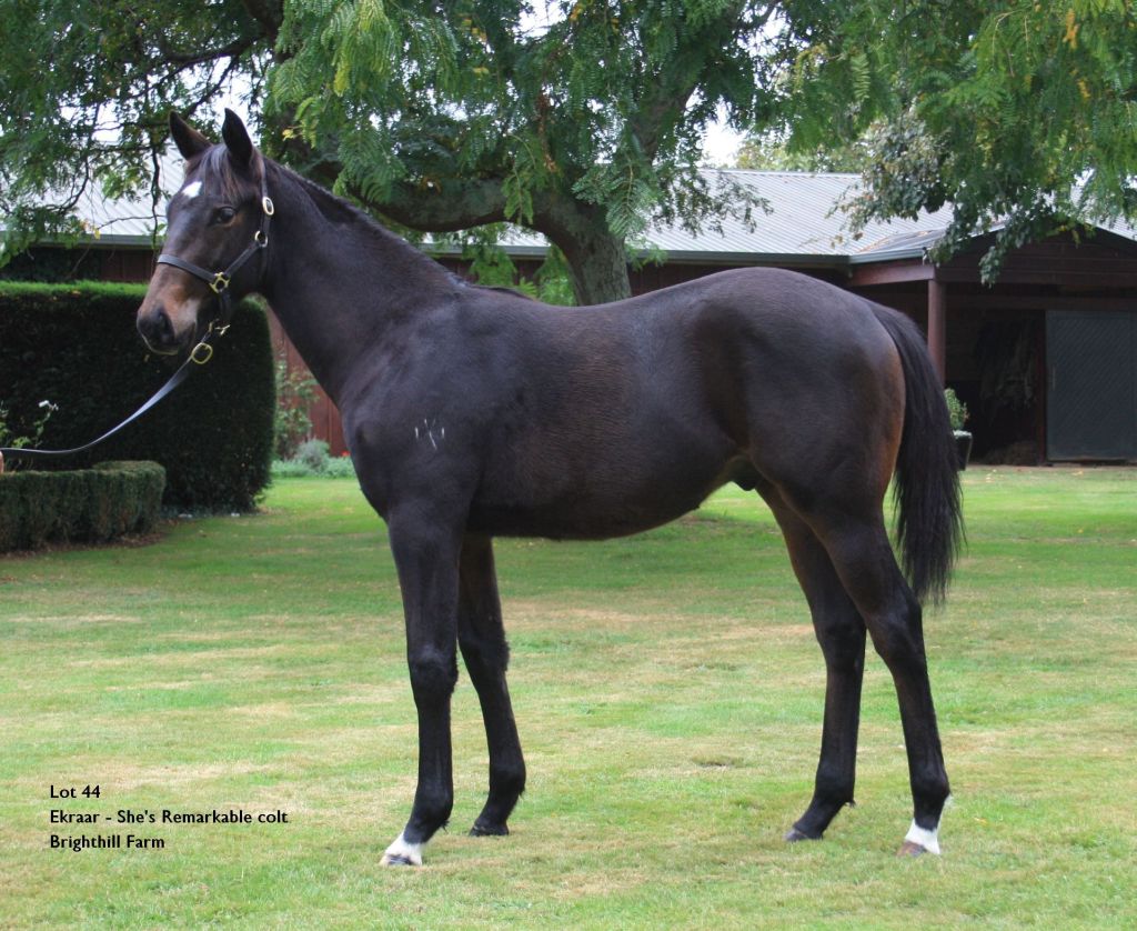 EKRAAR (USA) (Bay 1997-Stud 2004). 8 wins-1 at 2, Milan Gran Premio del Jockey Club, Gr.1. Leading NZ Sire (AEI) 2011-12. Sire of 365 rnrs, 188 wnrs, inc. SW Shez Sinsational (Hawke's Bay New Zealand Bloodstock Insurance Spring Classic, Gr.1), Habibi, Ekstreme, Rising Romance, Eclair Samba, Extra Explosive, Exceptionally, Solapur, Vivid Vixen, SP Angegreen, Carlotta, Clapton - Almighty Windpower (H.K.), etc. 1st dam SHE'S REMARKABLE, by Pentire. Unraced. Three-quarter-sister to XTRAVAGANT, HE'S REMARKABLE, half-sister to Maythehorse-bemagic, World Exclusive (dam of EXCLUSIVE LASS), Lucky Mascot (dam of KOALA BEAR). This is her first foal. 2nd dam ARLETTY, by Centaine. 8 wins from 1150m to 2000m, NZ$72,800, A$340,250, AJC Villiers S., Gr.2, STC Queen of the Turf S., Gr.2, ARC Ladies Mile, Gr.3, Royal S., Gr.3, AJC Breeders' Classic, L, 2d AJC Angst H., L, ARC Soliloquy S., L, 3d AJC Toy Show H., L, 4th New Zealand Oaks, Gr.1, NSW Tatt's RC Tramway H., Gr.3. Sister to FIRETAINE, Spillway, River Century(dam of LEGS, GUYNO), three-quarter-sister to SIXTY SECONDS, SPOTTSWOODE, Centico. Dam of 12 named foals, 10 to race, 9 winners, inc:- Maythehorsebemagic(Zabeel). 12 wins from 1400m to 3900m, NZ$93,910, A$335,253, MRC JRA H., 2d BRC Queen's Cup, Gr.3, VRC Andrew Ramsden S., L. Kaleidoscope. 6 wins from 1200m to 1600m to 2015-16, ARC Ideal Electrical Suppliers H., ATC Sportsyear Diary H., ARC Air Tahiti Nui Mile H. Black Tie. 3 wins from 1500m to 2200m to 2015-16, MRC Eliza Dry Cleaners P. Spinnaker. 2 wins at 1800m, 2000m, HKJC Tsam Chuk Wan H., Chevalier Igor's Group H., 3d HKJC Chatham H., Vacheron Constantin H., Congratulation H. World Exclusive. 2 wins at 1700m, 1750m in Aust. Dam of- EXCLUSIVE LASS(Nicconi). 3 wins at 1100m, 1200m, A$149,350, to 2015-16, Geelong RC Rosemont Stud S., L, MVRC Melbourne Signage Concepts H., 2d VRC Mrs Mac's Bakery Sprint, 4th MVRC Abell S.,L. Binalong Road. 9 wins to 1600m, A$261,440, to 2015-16, Bathurst TC CDRA Country Championship Qualifier, BRC Turn the Tide on Ovarian H. Lucky Mascot. Placed at 3 in Aust. Dam of- KOALA BEAR(Exceed and Excel). 2 wins-1 at 2-at 1050m, 1400m, A$98,703, SAJC Cinderella S., L, MRC Race-Tech H., 4th MRC Blue Diamond Preview (f), L, SAJC Queen Adelaide S., L. Axiom. Unraced. Dam of- XTRAVAGANT(Pentire). 5 wins-1 at 2-at 1400m, 1600m, NZ$423,750, A$15,000, to 2015-16, Waikato Sprint, Gr.1, New Zealand Two Thousand Guineas, Gr.1, ARC New Zealand Herald S., WRC Wellington Guineas Trial, 3d Waikato RC Hinuera Lodge H., 4th Levin Classic, Gr.1. HE'S REMARKABLE(Pentire). 6 wins from 1300m to 1600m, NZ$270,625, A$361,900, Newcastle JC Newmarket H., Gr.3, 2d New Zealand Two Thousand Guineas, Gr.1, WATC Railway S., Gr.1, 3d Hawke's Bay New Zealand Bloodstock Insurance Spring Classic, Gr.1, MVRC Crystal Mile H., Gr.2, Wellington S., Gr.3. |