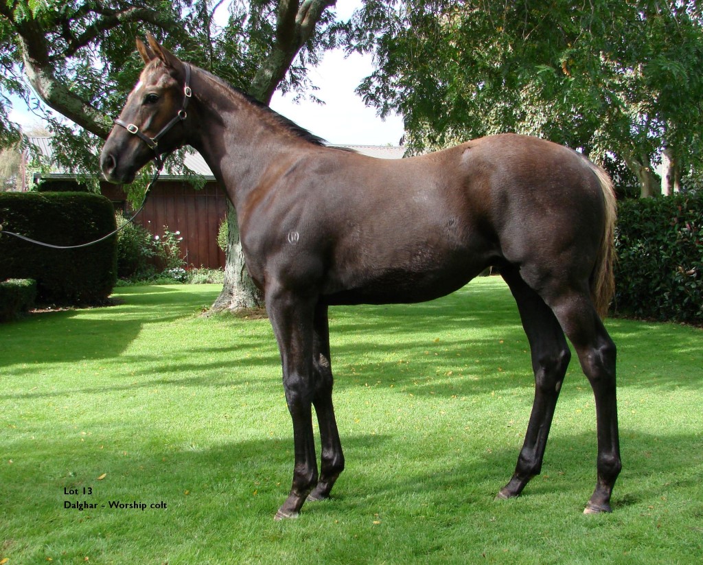 DALGHAR (FR) (Grey 2006-Stud France 2012, NZ 2012). 4 wins-1 at 2, Longchamp Prix du Palais-Royal, Gr.3. Sire of 45 rnrs, 17 wnrs. His oldest SH-bred progeny are 3YOs and inc SW Astara (ARC Champagne S., L) and of Golden Organic, Barabas, Gauguin, Miss Dalghar, Queen's Parade, Shadow Prince, Dig it Up, Nothinglefttolose, etc. His NH-bred progeny inc Lagaro, Saintnixa, Dalstar, Infinite Light, Vasygro, Saint Style, etc. 1st dam WORSHIP, by Irish River. Placed at 3 in GB. Three-quarter-sister to Eye Drop (dam of THORN TREE), half-sister to Kowtow (dam of PRECEDENCE), Upstage (dam of TAVISTOCK). This is her eleventh living foal. Her tenth foal is a yearling. Her ninth foal is a 2YO. Her eighth foal is an unraced 3YO. Dam of six foals to race, four winners, inc:- Gospel (g. by Pins). 4 wins at 1200m, 1400m, Manawatu RC Ascend Sales H., Waikato RC NZTI H., Wanganui JC Dave Hoskin Carriers H., 2d Counties RC Lime Country Thoroughbreds H., 3d Taranaki RC Hirequip H. Gold Rock (g. by Volksraad). 3 wins at 1200m, 1400m, CJC Racecourse Hotel & Motor Lodge H., 3d Otago RC Arthur Barnett & Brent Weatherall Jeweller H. Firelight (f. by Fantastic Light). 5 wins from 1400m to 2100m, 2d CJC Ellerslie International Flower Show H., 4th CJC Warstep S., L. Dam of- Zac Ace. Winner at 1400m in 2017 in Singapore. Bible Class (f. by Volksraad). Winner at 1200m, 2d Avondale JC Auckland 24 Hour Glass H. Dam of- SLICE OF CLASS(Guillotine). 4 wins at 1200m, 1400m, NZ$141,236, to 2015-16, CJC Canterbury Breeders S., Gr.3, Otaki Maori RC Hunting & Fishing Otaki H., 2d Egmont RC Taranaki Breeders S., Gr.3, Marton JC Pilet Contracting & Pioneer Seeds H., 3d Counties RC Auckland Thoroughbred Breeders, Gr.2, Wanganui JC Coro Angel Syndicate H.,4th WRC Thorndon Mile, Gr.1, Desert Gold S., Gr.3, CJC Warstep S., L. 2nd dam PEDESTAL, by High Line. Raced once. Half-sister to JUPITER ISLAND, PRECOCIOUS, PUSHY(dam of BLUEBOOK, MYSELF, FIRST), KRAYYAN, Picnicing, Putupon (dam of DANCEABOUT, POLE POSITION), Mrs Moonlight (dam of SOVIET FLASH). Dam of 9 foals, all raced, 4 winners, inc:- Diamond Look. 3 wins from 1400m to 2200m in GB, Bahrain and U.A.E, Nad al Sheba Derrinstown Stud Intikhab H. Upstage. Unplaced. Dam of- TAVISTOCK(Montjeu). Champion Sprinter in NZ on 2009-10. 6 wins-1 at 2-from 1100m to 1600m, NZ$333,025, A$286,375, Waikato Draught Sprint, Gr.1, Hawkes Bay Mudgway Partsworld S., Gr.1, VRC Blamey S., Gr.2, 2d WRC Thorndon Mile, Gr.1, MRC Vain S., L, 4th MRC Caulfield Guineas Prelude, Gr.3. Sire. Kowtow. Raced once. Dam of- PRECEDENCE(Zabeel). 10 wins from 1600m to 2600m, A$1,952,280, Moonee Valley Gold Cup, Gr.2-twice, VRC Queen Elizabeth S., Gr.3, BRC Premier's Cup, Gr.3, MVRC JRA Cup, Gr.3, STC NE Manion Cup, L, 2d MRC St George S., Gr.2, BRC Premier's Cup, Gr.3, ATC NE Manion Cup, L, VRC St Leger, L, 3d MRC Herbert Power S., Gr.2. The Raj(Grosvenor). 4 wins from 1200m to 1600m, NZ$93,175, 2d Manawatu Classic, Gr.3, Canterbury Gold Cup, Gr.3. |