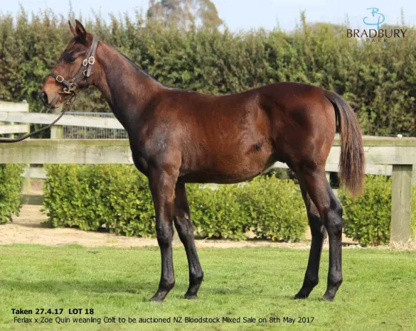 FERLAX (NZ) (Bay 2009-Stud 2014). 4 wins from 1200m to 1600m, A$411,000, VRC Australian Guineas, Gr.1, 2d MRC Memsie S., Gr.1. Out of a half-sister to SP Ankle Biter. Grandson of SW Leggings (SAJC Lord Mayorâ??s Mile, L). Related to SW Sound Horizon (AJC All-Aged S., Gr.1), SW Cats Fun (WATC Derby, Gr.1), SW Trappings (Western Australian Oaks, Gr.1), SW The Pooka, etc. His oldest progeny are yearlings. 1st dam ZOE QUIN, by Kashani. 4 wins to 1400m, NZ$79,525, BOP RC Stewart Browne Group H., Taranaki RC Matador Meats 3YO H., Te Aroha JC Majestic Horse Floats H., 2d Waikato RC Classic Hits 98.6ZHFM H., WRC Douro Cup, BOP RC Bayleys Tauranga H. Half-sister to Maz Quin - Regency Dragon(H.K.). This is her fifth foal. Her fourth foal is a yearling. Her third foal is a 2YO. Her second foal is an unraced 3YO. Her first foal is unraced. 2nd dam BEMUZE, by Centro. 3 wins at 1200m, 1400m, BOP RC Port of Tauranga Ltd H. Dam of 8 named foals, 7 to race, 6 winners, inc:- Maz Quin - Regency Dragon(H.K.) (D'Cash). 6 wins at 1300m, 1400m, NZ$55,800, HK$4,549,750, HKJC Chinese New Year Cup, BOP RC Ultimate Motor Group Ford 3YO H., Marton JC Richards Constuction 3YO H., HKJC Ashley H., Mei Tin H., 2d Cambridge Breeders' S., Gr.3, HKJC Sprint Cup, L, 3d Hong Kong Macau Trophy, L, 4th HKJC Premier Cup, L. Agent Ziva. 5 wins to 1250m, NZ$76,350, Waikato RC Pauline & Ralph Bax H. 3rd dam MEZMERIZE, by Marceau. 7 wins from 1150m to 1600m, Matamata Cup, L, ARC Goldstar Members' Mile H., Rotorua Veterinary Services H., BOP RC AGC Finance H., 2d AJC Liverpool City Cup, Gr.3, Matamata Cup, L, Gosford RC Belle of the Turf S., L, 4th Egmont RC Evergreen S., L. Half-sister to MOUNTAIN RULE, Bella Lunar (dam of MOONRISE). Dam of 5 named foals, all raced, 4 winners, inc:- Bemuze. 3 wins. See above. 4th dam ZAMAREIGN, by Zamazaan. Unraced. Sister to Inhabitant (dam of CRYSTAL BROOK, ROMFORD - KIM KIM II(Mal.)), half-sister to Regal Dance,Fleeting World (dam of HEROICITY). Dam of 7 foals, 5 to race, all winners, inc:- MOUNTAIN RULE(Wolverton). 4 wins at 2000m, 2400m, A$316,370, QTC PJ O'Shea S., Gr.2, AJC Tooheys Draught Welter H., Moet & Chandon H., 2d BATC Labour Day Cup, L, 3d AJC Derby, Gr.1, QTC Brisbane Cup, Gr.1, VATC Coongy H., Gr.3, 4th VRC Queen Elizabeth S., Gr.2. MEZMERIZE(Marceau). 7 wins. See above. In the Pink. 2 wins to 1300m, AJC Strathfield Car Radios H. Grandam of- PELICANO(Court of Jewels). 10 wins-1 at 2-from 1300m to 2600m, A$510,800, ATC Parramatta Cup, L, SAJC Birthday Cup, L, Murray Bridge Gold Cup, L, Werribee Cup, L, 2d SAJC Penang Trophy, L. Bella Lunar. Unraced. Dam of- MOONRISE(Shalford). 6 wins from 1600m to 2400m, A$172,265, WATC Belmont Park Cup, L, Leading Owners H., Cockburn H., Western Warriors H., 2d WATC Perth Cup, Gr.2, Anniversary Cup, L. |