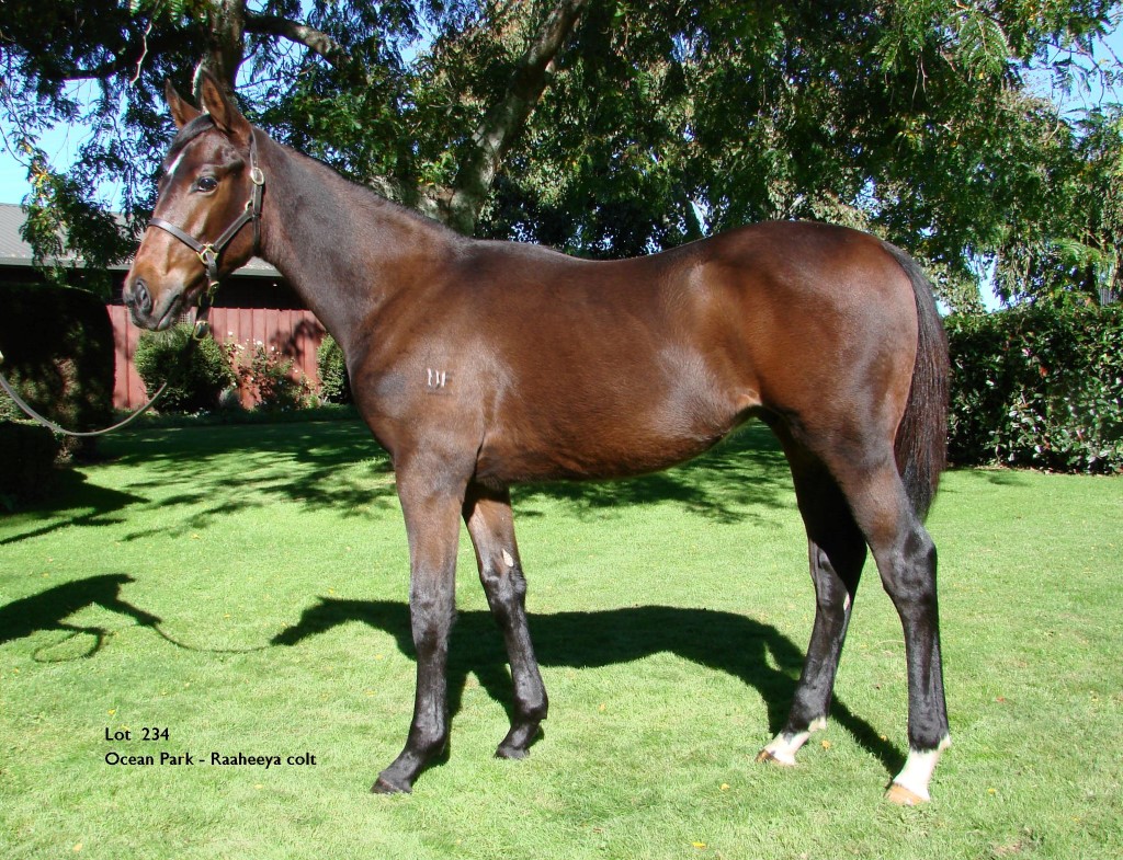 OCEAN PARK (NZ) (Bay 2008-Stud 2013). Horse of the Year in NZ in 2012-13. Champion Middle Distance Horse in AUS & NZ in 2012-13. 8 wins from 1200m to 2050m, NZ$343,925, A$2,529,000, MVRC WS Cox P., Gr.1, ARC New Zealand S., Gr.1, MRC Underwood S., Gr.1, Caulfield S., Gr.1. Out of a half-sister to the dam of SW Prince Kaapstad (ARC Easter H., Gr.1). Sire of Beerzatbernz, etc. His oldest progeny are 2YOs. 1st dam RAAHEEYA, by Henrythenavigator. Unraced. This is her third foal. Her second foal is a yearling. Her first foal is a 2YO. 2nd dam CANDY CRITIC, by Candy Stripes. Joint Champion Stayer in South Africa in 2005-06. 4 wins-1 at 2-from 1400m to 2450m, £163, R704,750, 177,376Dhs, South African Oaks, Gr.2, 2d Turffontein South African Fillies Classic, Gr.1, Gauteng Fillies Guineas, Gr.2, Clairwood Debutante S., Gr.3, Nad al Sheba Al Tayer Motors Challenge, 3d Nad al Sheba E+ H., 4th Clairwood Thekwini S., Gr.1, Turffontein Gommagomma Challenge, Gr.2. Half-sister to LA DANZADORA. Dam of 5 named foals, 3 to race, all winners, inc:- Samhaan. 5 wins from 1200m to 1600m, R243,975, Greyville Caresse Marine Wine H., Denise McGee H., Scottsville Soccer 6 P. Candy Rock. 2 wins at 1700m, R191,295, to 2015-16, Vaal Computaform Express H. Fast Candy. Winner at 1200m in 2015-16 in Aust. 3rd dam TOUGH DANCER, by Tough Critic. Winner in Argentina. Half-sister to MALAMBO DANCER, Andaluza Dancer, Fox Trot Dancer (dam of FOX DANCER). Dam of 13 foals, 11 to race, 6 winners, inc:- CANDY CRITIC(Candy Stripes). 4 wins. See above. LA DANZADORA(El Sembrador). 4 wins-1 at 2-from 1200m to 1600m in Argentina, Palermo Clasico General Luis Maria Campos, Gr.2, Clasico Asociacion Propietarios de SPC, Gr.3, 2d Palermo Clasico Francisco J. Beazley, Gr.2, 3d Palermo G.P. Estrellas Juvenile Fillies, Gr.1. Fitz Dancer. 3 wins at 1350m, 1600m in South Africa and Mauritius. Elegido Fitz. 2 wins at 1600m, 2000m in Argentina, 4th San Isidro G.P. 25 de Mayo, Gr.1. 4th dam MARIACHE'S DANCER, by Mariache. Raced once. Three-quarter-sister to Escaramouche, Escoleta (dam of ESCOLETA FITZ), half-sister to Enmendada (dam of ESTRICTA), Escola Do Samba (dam of ESCOLTADA, ESCOLTADO, EVALUADO, EXPRESS NEWS), Escolasera Top (dam of ESCENOGRAFO). Dam of 8 foals, 6 to race, all winners, inc:- MALAMBO DANCER(Forlitano). 2 wins in Argentina, San Isidro G.P. Gran Criterium, Gr.1. Andaluza Dancer(Forlitano). Winner in Argentina, 3d Palermo G.P. Seleccion, Gr.1, 4th San Isidro Clasico Enrique Acebal, Gr.1. Fox Trot Dancer. 2 wins in Argentina, 4th San Isidro Handicap Espirita, L. Dam of- FOX DANCER(Lode). 7 wins at 1400m, 1600m in Argentina, San Isidro G.P. San Isidro, Gr.1, Clasico 9 de Julio, Gr.2-twice, Clasico Ecuador, Gr.2, 4th Palermo Clasico Peru, Gr.2. Sire. |