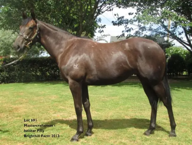 1st dam ISTISTAR, by Istidaad. 10 wins from 1200m to 1600m, NZ$352,525, WRC Cuddle S, Gr.3, Rotorua S., L, BOP RC Tauranga Classic, L-twice, WRC Galaxy S., Waikato RC Southworth Consulting H., Taranaki RC Interprovincial Championship, 2d Counties RC Auckland Thoroughbred Breeders' S., Gr.2, BOP RC Tauranga Classic, L, 4th WRC Cuddle S., Gr.3. This is her second foal. Her first foal is a 2YO. 2nd dam MARLANDA STAR, by Star Way. Unraced. Dam of 4 foals, all raced, 3 winners, inc:- ISTISTAR(Istidaad). 10 wins. See above. Magic Diva. 2 wins at 1000m, 1100m to 2012, Singapore TC Class 5 H.-twice, 2d Singapore TC Class 4 H. My Spirited Star. Winner at 1450m in 2011-12. 3rd dam TRUISM, by Truly Vain. Raced once. Dam of 4 foals, 3 to race, inc:- Mr Orbit. 2 wins at 1600m, 2150m in Aust. 4th dam CLUE, by Imposing. Winner at 2, 2d ARC Victoria H. Half-sister to WALLSTREET, Makamint. Dam of 2 named foals, 1 to race, inc:- Grange Belle. Unraced. Dam of- L' Eleve. 5 wins from 1100m to 1600m, 2d QTC Lady Elwes H., 3d QTC Mercedes-Benz of Brisbane H., Wynns Coonawarra Estate H. 5th dam HINT, by Three Legs. 1984 Wrightson Southern Filly of the Year. 9 wins-3 at 2-from 1000m to 1600m, Otago Mannequin S., L, Southland RC Ascot Park S., L, Geraldine Challenge S., L, North Canterbury RC Inglewood S., L, Oamaru JC Waitaki S., L, 2d Rotorua RC Arawa S., Gr.3, 4th New Zealand One Thousand Guineas, Gr.1. Sister to Tricycle, half-sister to Hoot (dam of HOOTANDANCE). Dam of 12 named foals, 10 to race, 6 winners, inc:- WALLSTREET(Kaapstad). 9 wins-3 at 2-from 1000m to 1650m, NZ$3,900, A$109,260, SAJC West End Draught SA S., Gr.3, QTC CK Smith Welter H., ARC Cadbury Slab Juvenile H., SAJC Adbet 2YO H., 2d SAJC Just a Dash H., 3d SAJC Angas Brut Classic S., Gr.2, 4th MVRC CS Hayes S., Gr.3. Makamint(Gold Brose). 3 wins-1 at 2-at 1200m, 1400m, Hawke's Bay Te Runga 3YO H., Jeff Gray BMW 3YO H., 3d Rotorua S., L, 4th New Zealand Bloodstock Insurance S., L. Get the Hint. Winner at 1400m, 3d MVRC Paul Kelly Concert H. Dam of- Follonica(Flying Spur). 7 wins-1 at 2-to 1300m, A$191,115, to 2012-13, MRC Catanach's Jewellers H., MVRC SKM Recycling H., 3d MRC Carlton Draught Alinghi S., L, 4th MRC Mannerism S., Gr.3. |