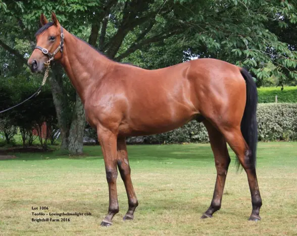 TEOFILO (IRE) (Bay 2004-Stud 2009). 5 wins at 2, Newmarket Dewhurst S., Gr.1. Sire of 532 rnrs, 311 wnrs, 48 SW, inc. Trading Leather (Irish Derby, Gr.1), Voleuse de Coeurs, Pleascach, Kermadec, Parish Hall, Havana Gold, Sonntag, Loch Garman, Amralah, Arod, Tarfasha, Amira's Prince, Light Heavy, Tamaanee, Samba Brazil, Royal Empire, First Victory, Sanus Per Aquam, Loritania, Flight Risk, Tobann, Fate, etc. 1st dam LOVINGTHELIMELIGHT, by Lemon Drop Kid. 4 wins from 1600m to 2000m, BRC Markinsons H., Waikato RC DD Bloodstock H., BRC Carlton Mid P., 2d BRC Coca Cola H., 3d BRC Oztronics H., Timeform H., Trade Coast Legal H., Qld Tatt's RC Hardy Brothers Jewellers H. Half-sister to Shine Forth (dam of BOURBON COURAGE). This is her first foal. 2nd dam SISTER CROWN, by Danzig. Unraced. Sister to CHIEF'S CROWN, three-quarter-sister to Lady Danz (dam of A SHIN G LINE), half-sister to CLASSIC CROWN, Tribunal, Jeweled Crown (dam of SILK PHOENIX). Dam of 7 foals, 4 to race, 3 winners, inc:- Lovingthelimelight. 4 wins. See above. Shine Forth. Placed in U.S.A. Dam of- BOURBON COURAGE(Lion Heart). 4 wins from 6f to 9f, US$1,129,187, Louisiana Super Derby, Gr.2, 2d Gulfstream Donn H., Gr.1, Hoosier Indiana Derby, Gr.2, Mountaineer West Virginia Derby, Gr.2, Delaware Hockessin S., L, 3d Aqueduct Cigar Mile H., Gr.1, Churchill Downs Clark H., Gr.1, Alysheba S., Gr.2, Fair Grounds New Orleans H., Gr.2. 3rd dam SIX CROWNS, by Secretariat. 5 wins-1 at 2, Meadowlands Meadow Queen S., L, 2d Meadowlands Queen Charlotte H., L, Miss Liberty H., L, 3d Aqueduct Ladies H., Gr.1, Searching S., L, Busher H., L, Belmont Athenia H., L. Sister to Center Court Star (dam of LAMBENT LIGHT, BEST STAR), half-sister to WIMBLEDON STAR, Tournament Star, Nijinsky Star (dam of REVASSER, HOMETOWN QUEEN, VIVIANA). Dam of 14 foals, 8 to race, 7 winners, inc:- CHIEF'S CROWN(Danzig). 12 wins-6 at 2-from 5½f to 1¼m, US$2,191,168, Breeders' Cup Juvenile S., Gr.1, Belmont Cowdin S., Gr.1, Keeneland Blue Grass S., Gr.1, Santa Anita Norfolk S., Gr.1. Champion sire. CLASSIC CROWN(Mr. Prospector). 4 wins-2 at 2, US$535,919, Belmont Frizette S., Gr.1, Gazelle H., Gr.1, 2d Belmont Ruffian H., Gr.1, Beldame S., Gr.1, 3d Saratoga Test S., Gr.1. Grandam of- REACH THE CROWN(Special Week). 4 wins-2 at 2-at 1600m, 1800m, 257,836,000¥, Hanshin Yomiuri Milers Cup, Gr.2, Kyoto Kisaragi Sho, Gr.3, 2d Tokyo Yushun, Jpn-1, Hanshin Kobe Shimbun Hai, L. A SHIN G LINE(Giant's Causeway). 9 wins-1 at 2-from 1400m to 3300m, 258,528,000¥, Kokura Daishoten, Gr.3, 2d Hanshin Asahi Challenge Cup, Gr.3, 3d Kokura Nikkei Open, L, Nagoya Daishoten, L. Jeweled Crown. Winner at 8½f in U.S.A. Dam of- SILK PHOENIX(Adjudicating). 5 wins from 1200m to 2100m, 176,509,000¥, Kawasaki Empress Hai, Jpn-2, Empress Hai, 2d Funabashi Queen Sho, Jpn-3, Kawasaki Sparking Lady Cup, Jpn-3. |