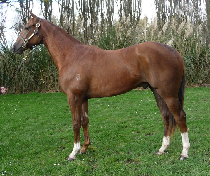 1st dam ELECTRIC AVENUE, by Hector Protector. Raced twice. Half-sister to Flidais. This is her fifth living foal. Her fourth foal is an unraced 3YO. Dam of two foals to race- Five Coats(f. by Coats Choice). 2 wins at 1200m, Otago RC Speight's H., 3d Otago Breeders' S., L, CJC Karaka Sales 3YO P. Beauregard (g. by My Halo). Placed in 2011, 3d Singapore TC TD Securities Cup, Emirates Copenhagen S., Class 5 H. 2nd dam ELECTRONIC, by First Norman. Joint top filly on The 1995-96 Australasian 4YO+ Classification. 9 wins from 1400m to 2600m, NZ$9,350, A$1,080,180, AJC Metropolitan H., Gr.1, STC Ranvet S., Gr.1, GCTC Prime Minister's Cup, Gr.2, STC Canterbury Cup, Gr.3, 2d AJC Colin Stephen H., Gr.3, 3d Newcastle Gold Cup, Gr.2, ARC Royal S., Gr.3, 4th STC Mercedes Classic, Gr.1, AJC Queen Elizabeth S., Gr.1. Dam of 6 named foals, all raced, 2 winners, inc:- Flidais(Timber Country). Winner at 1850m, 3d AJC Adrian Knox S., Gr.3, Cabravale Diggers Ern Kavanagh H. Dam of- Rush(Charge Forward). 3 wins at 1200m, 1400m in 2011, Singapore TC Open 2YO S., Fort Canning Park H., Charity Graduation S., 2d Singapore TC Magic Millions Juvenile Championship, Sgp-3. 3rd dam AEGEAN BLUE, by Blue Vermillion. Raced twice. Half-sister to SYRIAN SEA, (My) Aegean Princess. Dam of 9 named foals, all raced, 6 winners, inc:- ELECTRONIC(First Norman). 9 wins. See above. Propagate. 5 wins from 1400m to 2100m, ARC Bride & Groom Show H. Kapkama - Supreme Warrior (H.K.). 2 wins at 1800m, 2000m, HKJC Piaget Possession H., Jaffe H. Atalantis. Winner at 2000m in Aust. Dam of- Sleepy Tripp. 9 wins from 1400m to 2100m, NZ$111,838, ARC One Digital H. Punt Higher. 5 wins to 2200m, Avondale JC First Sovereign Trust H. 4th dam AEGEAN SEA, by Beaufort Sea. 5 wins-1 at 2-at 1200m, 1400m, Southland RC Ascot Park S., L, 2d CJC Champagne S., L, Geraldine Challenge S., L. Sister to IONIAN SEA, half-sister to Dark Princess (dam of SOMBRE LEGEND). Dam of 14 named foals, 13 to race, 8 winners, inc:- SYRIAN SEA(Vice Regal). 4 wins-1 at 2-at 1200m, 1600m, Wellington S., Gr.3, 2d CJC Warstep S., L, 3d ARC Ladies Mile, Gr.3. Grandam of- BOOMING(Don Eduardo). 8 wins from 1200m to 2300m, WRC Thorndon Mile, Gr.1, ARC Zabeel Classic, Gr.1, 2d Auckland Cup, Gr.1. Unbroken |